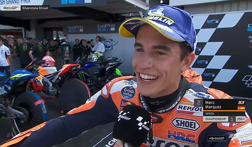 A peine descendu de sa Honda RC213 officielle après avoir obtenu la 2e place du Grand Prix de Grande-Bretagne sur le circuit de Silverstone, Marc Márquez s’est confié devant la caméra du site MotoGP.com avec des sentiments un peu partagés...
