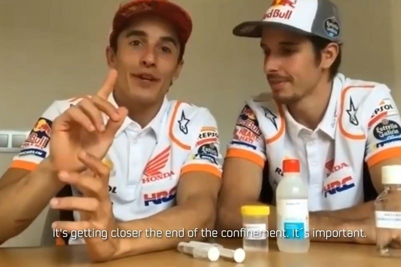 « Pendant la pandémie de Covid-19, il est très important de suivre des directives d’hygiène spécifiques pour arrêter l’infection. C’est pourquoi Marc et Álex Márquez ont voulu savoir comment on peut produire du gel hydroalcoolique avec des produits que nous avons habituellement chez nous. »