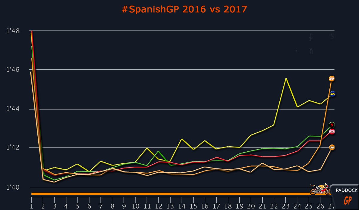 Choix de pneumatiques ou pas, toujours est-il que les performances des machines de Tokyo n’ont aucunement diminué tout au long de la course. Pour les départager, on remarquera que Dani Pedrosa a creusé l’avantage sur Marc Márquez durant les quatre premiers tours, la palme de la constance revenant toutefois à ce dernier qui s’était visiblement transformé en métronome en Andalousie. C’est simple : pensons pas avoir déjà vu une courbe aussi plate ! Ceci démontre un travail parfait du numéro 93, en fonction de son matériel.