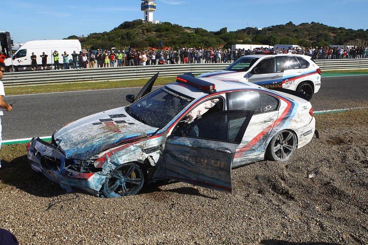 Ce n’est pas parce que l’on assiste à un Grand Prix d’Espagne moto à Jerez que les accidents se limitent aux seules chutes des pilotes. Il y a aussi des voitures cassées sur le tracé de Jerez. La preuve avec la voiture de sécurité qui a été un peu trop malmenée par un certain Franco Uncini.