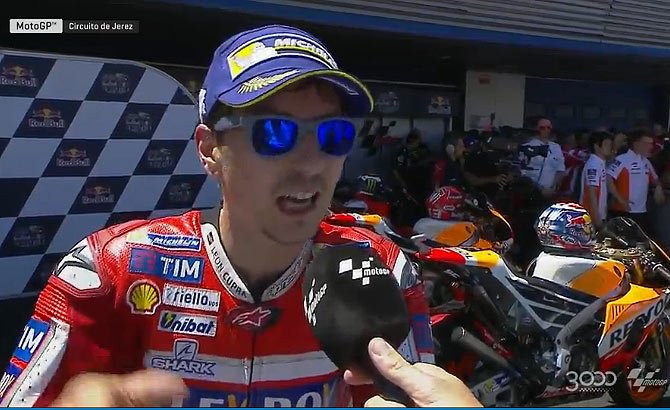A peine descendu de sa Ducati GP17 après avoir obtenu une troisième place au Grand Prix d’Espagne à Jerez, Jorge Lorenzo ne pouvait pas cacher sa joie après avoir connu un début de saison particulièrement difficile en tentant de s’acclimater à la brutale italienne.