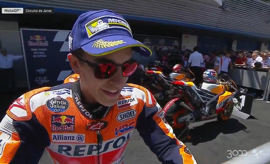 Marc Márquez : « Oui. Honnêtement, j’ai attaqué et essayé de rester à une ou deux secondes derrière lui pour essayer de le passer à la fin, mais depuis le début je sentais que le pneu avant était trop tendre et engendrait trop de mouvements. C’était presque critique. Et donc, je savais que dans ces conditions, Dani est le meilleur. Je veux dire qu’il est vraiment coulé, il force moins au freinage. Je savais que ça allait être difficile mais même si c’était le cas, j’ai essayé jusqu’à la fin. Mais quand il ne restait que trois tours, je me suis fait une grosse chaleur et me suis dit « OK ». J’ai vu que la deuxième position était une vraiment bonne place ici. Je suis très heureux car je peine toujours à Jerez, mais nous avons été forts ici, je suis très confiant. »