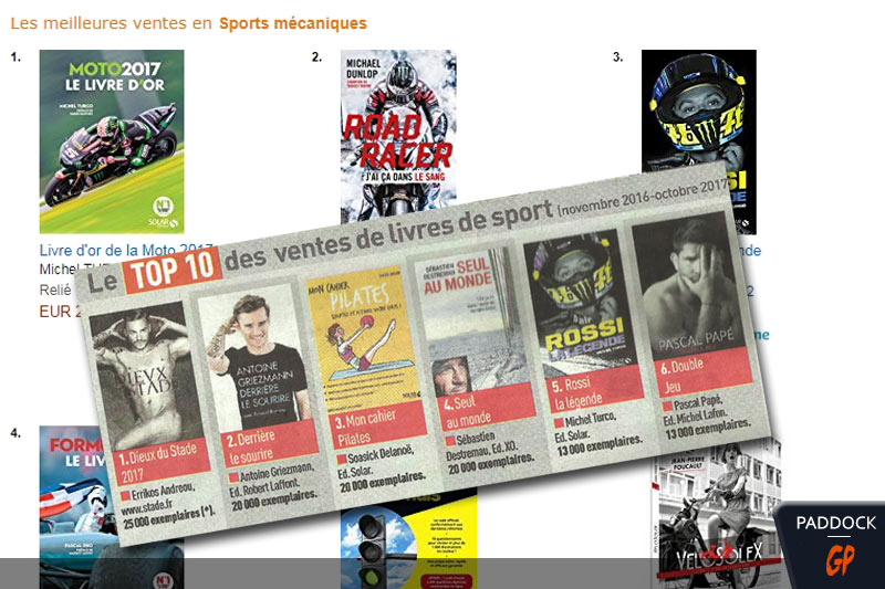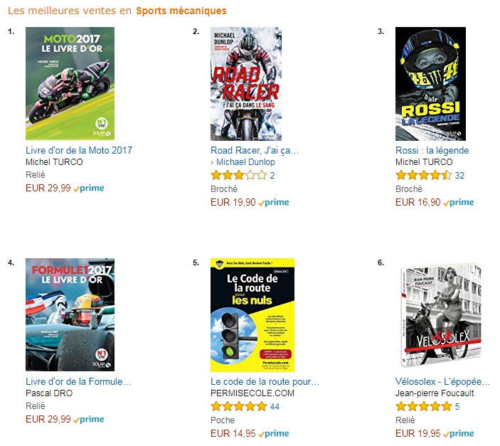 Peut-être, mais pas si sûr, car si l’on consulte le classement des meilleures ventes actuelles de livres de sports d’Amazon, la plus grande librairie de France, le Livre d’or de la moto 2017 de Michel Turco (encore lui !) arrive 18e, bien avant son homologue de la Formule 1 (35e) malgré un nombre d’automobilistes plus de 10 fois supérieur à celui des motards.