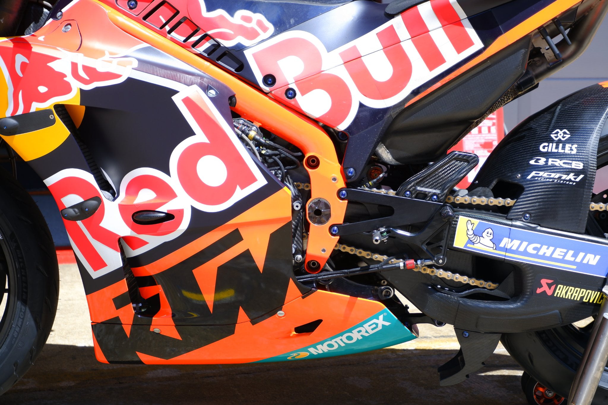 KTM avait apporté à Barcelone a un châssis très légèrement différent : la base du châssis lui-même est la même mais ce qui a changé est le pivot du bras oscillant. Il a été retravaillé, leur permettant désormais de déplacer l’emplacement du pivot vers l’avant et vers l’arrière ainsi que vers le haut et vers le bas. Brad Binder a déjà eu l’opportunité de tester cette évolution en course cette année et à Barcelone, Miguel Oliveira l’essaie également.
