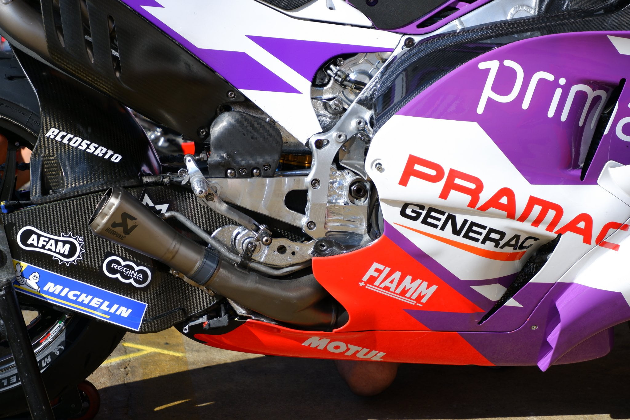 Ici, les ingénieurs de Borgo Panigale ont modifié la longueur de l’échappement inférieur de la machine de Michele Pirro, qui permet d’évacuer les gaz des cylindres situés à l’avant du V4. Les échappements impactent les ondes de pression, et modifier la longueur et/ou le diamètre des tubes dans certaines zones engendre des impacts sur ces ondes de pression et leurs efforts. Ducati n’a pas vraiment besoin de plus de puissance et de vitesse de pointe, il est donc probable que cet échappement leur permette de trouver un couple plus bas dans la plage de régime et de rendre la puissance de Ducati plus utilisable en courbe.