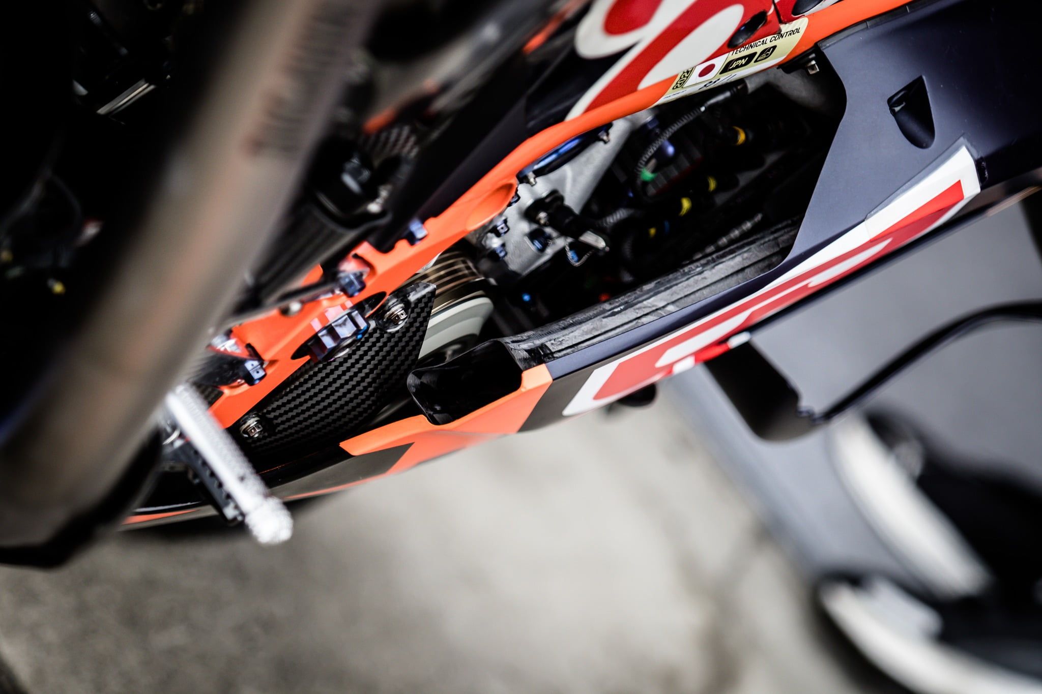 Sur cette photo de la Honda RC213V de Marc Marquez, on peut s’attarder sur deux éléments. Le premier concerne le changement de châssis que le pilote Espagnol utilise depuis le Japon. Il est en fait revenu au châssis standard développé pour la saison 2022. Il est possible de le distinguer par le boulon du pivot du bras oscillant. Ici, on observe la version du châssis qui utilise le gros écrou rond, mais auparavant, Marc Marquez avait utilisé une version qui n’a pas ce gros écrou rond et qui repose juste au ras du cadre.