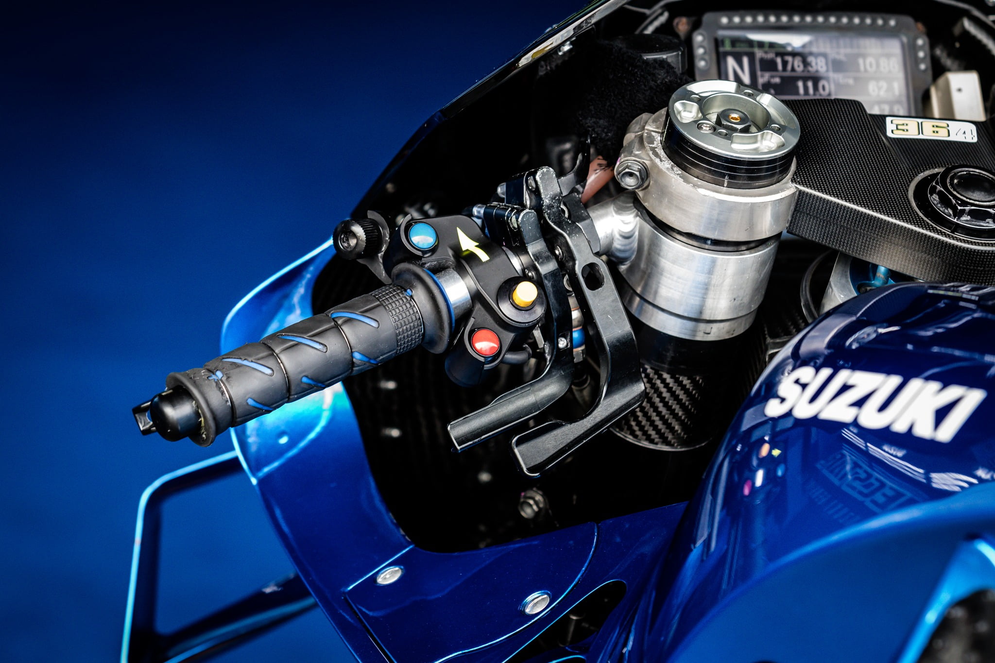 Vous pouvez voir ici les boutons que Joan a à sa disposition, destinés aux cartographies de frein moteur, de puissance et au contrôle de traction. On note également la présence de deux leviers activables au pouce : l’un est destiné à activer le dispositif de Ride Height Device et l’autre concerne le Holeshot Device de sa Suzuki.
