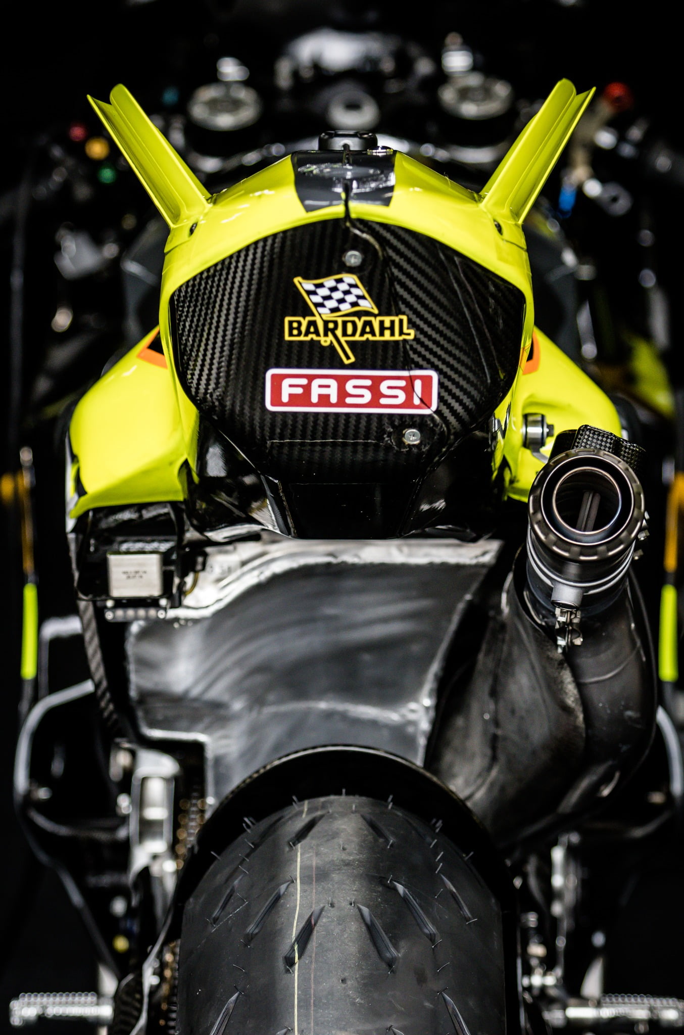 Voici une une excellente photo qui permet de juger de la mesure dans laquelle la Ducati a été adaptée pour accueillir le Ride Height Device arrière. Tout est conçu pour donner le plus d’espace possible à la roue arrière : le réservoir de carburant est incurvé et l’échappement arrière est décalé sur le côté, voire l’extérieur de la machine.