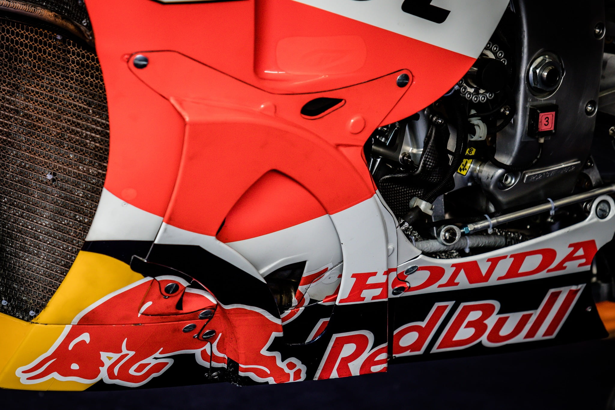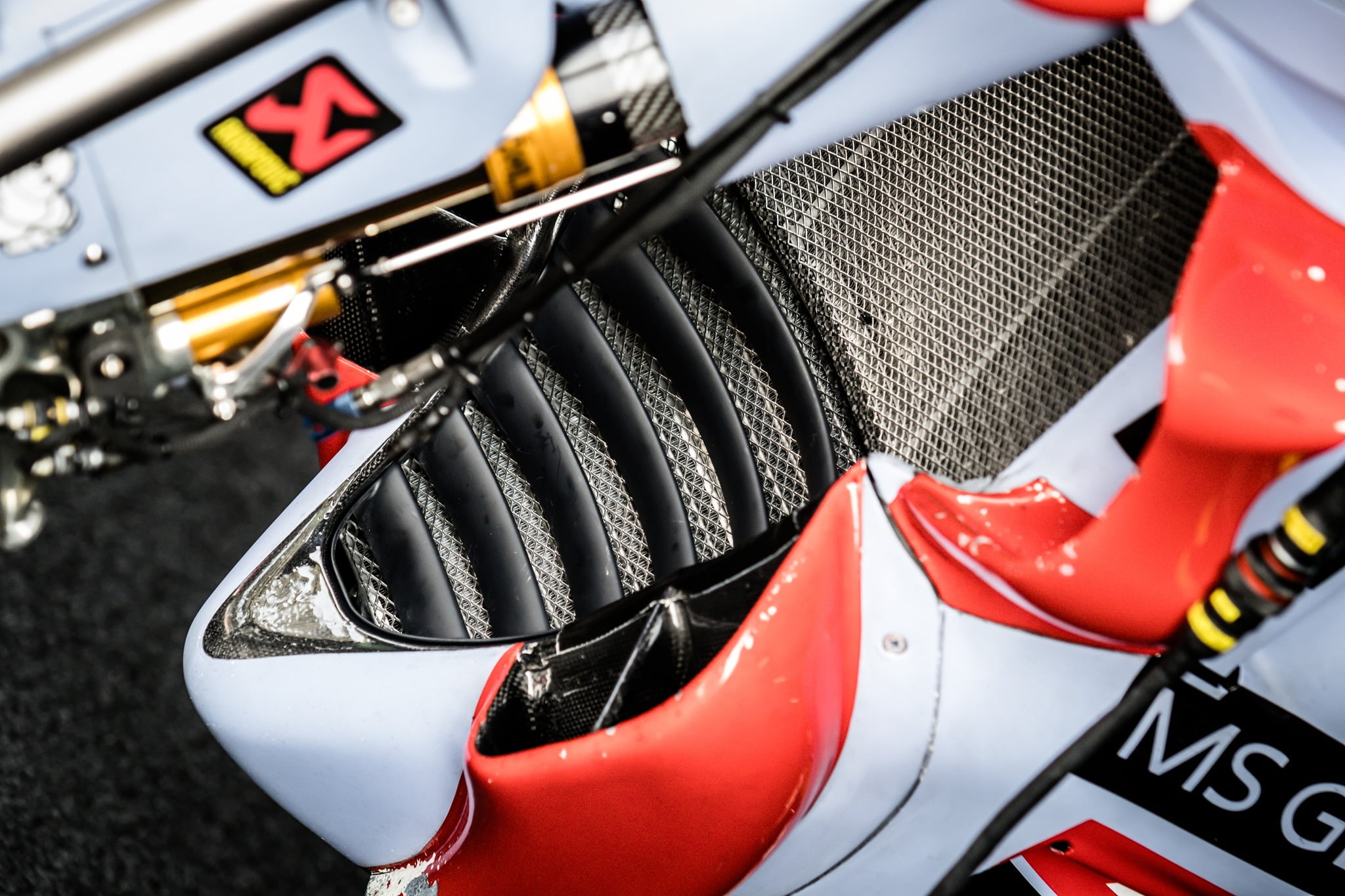 Les nouveaux conduits qui semblent diriger le flux d’air vers le bas de Honda intriguent beaucoup pour le moment. Au premier abord, il semblerait qu’il s’agisse d’une copie du design de Ducati, et bien qu’il puisse s’agir d’une copie de l’exploration du même effet, le design est assez différent. Ils ont une hauteur d’ouverture similaire à celle de la Ducati mais tout aussi large. Le rayon est également plus grand, ce qui leur donne une surface globale beaucoup plus grande que celles de Ducati et l’autre point intrigant est l’ouverture au milieu du conduit lui-même.