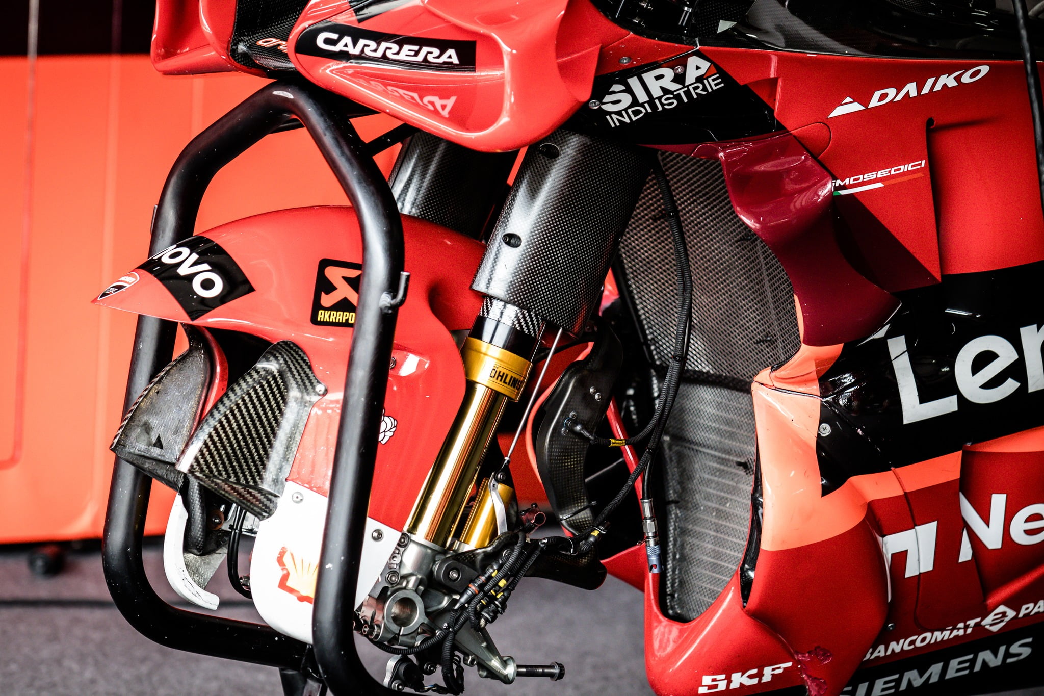 On observe sur cette photo le conduit de la Ducati, ainsi qu’une multitude d’autres éléments.