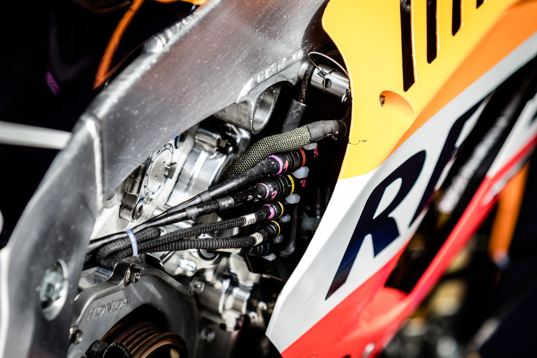 L’électronique est l’une des parties les plus importantes de la technique en MotoGP. Ici, on ne peut voir qu’une petite partie des connecteurs électroniques qui extraient les données des capteurs sur le prototype. Ces boitiers sont installés dans des zones faciles d’accès car il est souvent probable qu’ils devront être remplacés soit par des dommages lors d’un accident, soit simplement parce qu’ils ont atteint la fin de leur cycle de vie.