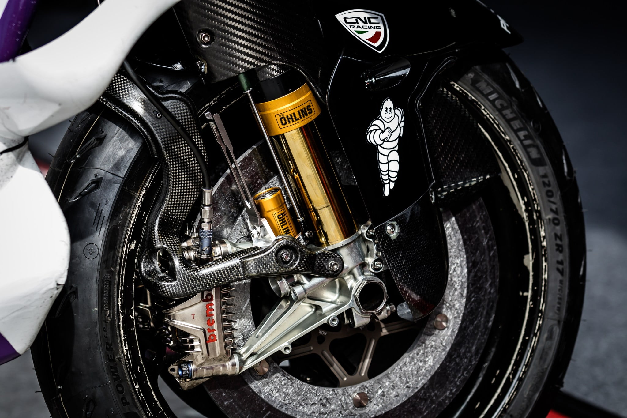 Mis à part les disques de frein en carbone et les étriers Brembo, il y a une petite pièce en carbone qui se fixe au même point que l’étrier et s’étend tout autour de l’arrière de la roue avant.
