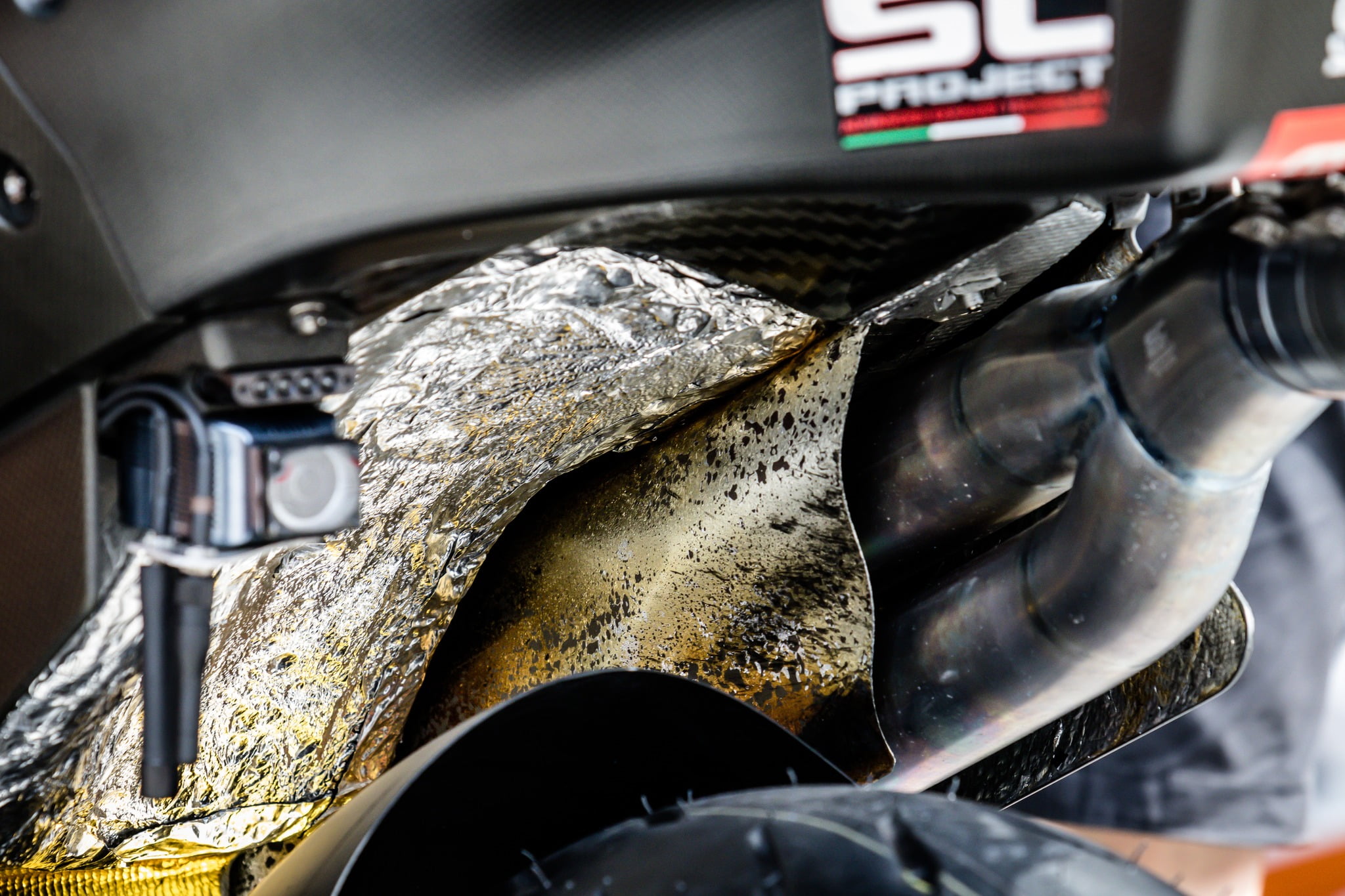 Les équipes de MotoGP font des choses très intelligentes pour protéger leurs réservoirs de carburant de la chaleur, le matériau réfléchissant la chaleur n’en est qu’un exemple. Un autre moyen est de canaliser l’air juste à côté du réservoir de carburant en tant que tampon pour que l’air de refroidissement circule juste à côté et empêche la chaleur de l’extérieur d’atteindre si facilement le réservoir de carburant.