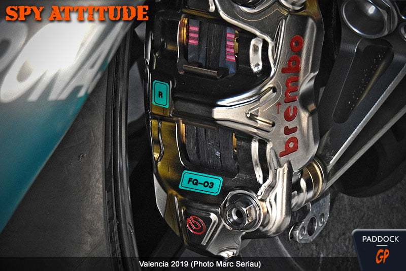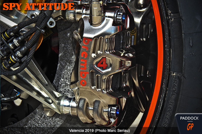 En fait, nous avions repéré cette nouvelle version des étriers radiaux 4 pistons Brembo l’année dernière lors des tests à Valence, et l’avions reportée dans notre rubrique “Spy Attitude”, mais cette fois, plus questions d’essais pré-saison: on utilise ou on n’utilise pas, suivant que l’on a acheté ou pas.