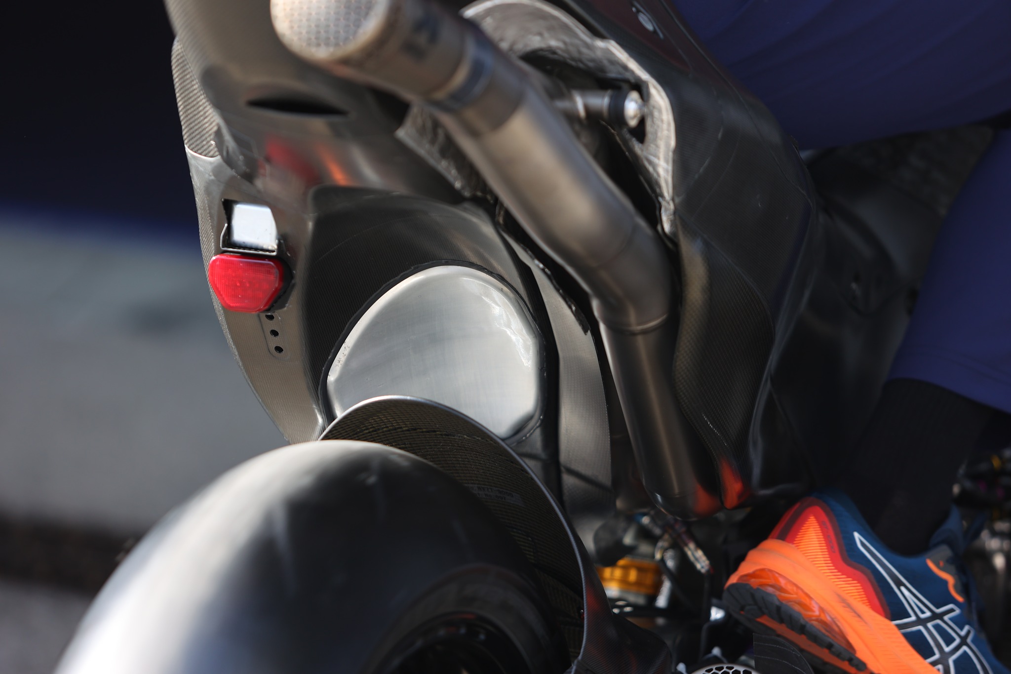 Les similitudes entre Honda et Ducati se poursuivent dans la partie arrière de la machine, qui est devenue plus petite avec un abaissement conséquent du réservoir. On retrouve également les désormais célèbres ailerons arrière, amenés sur la piste par le constructeur de Borgo Panigale, et imité par la concurrence. Bref, la guerre du développement technique, avec les constructeurs italiens comme modèle actuel à suivre.