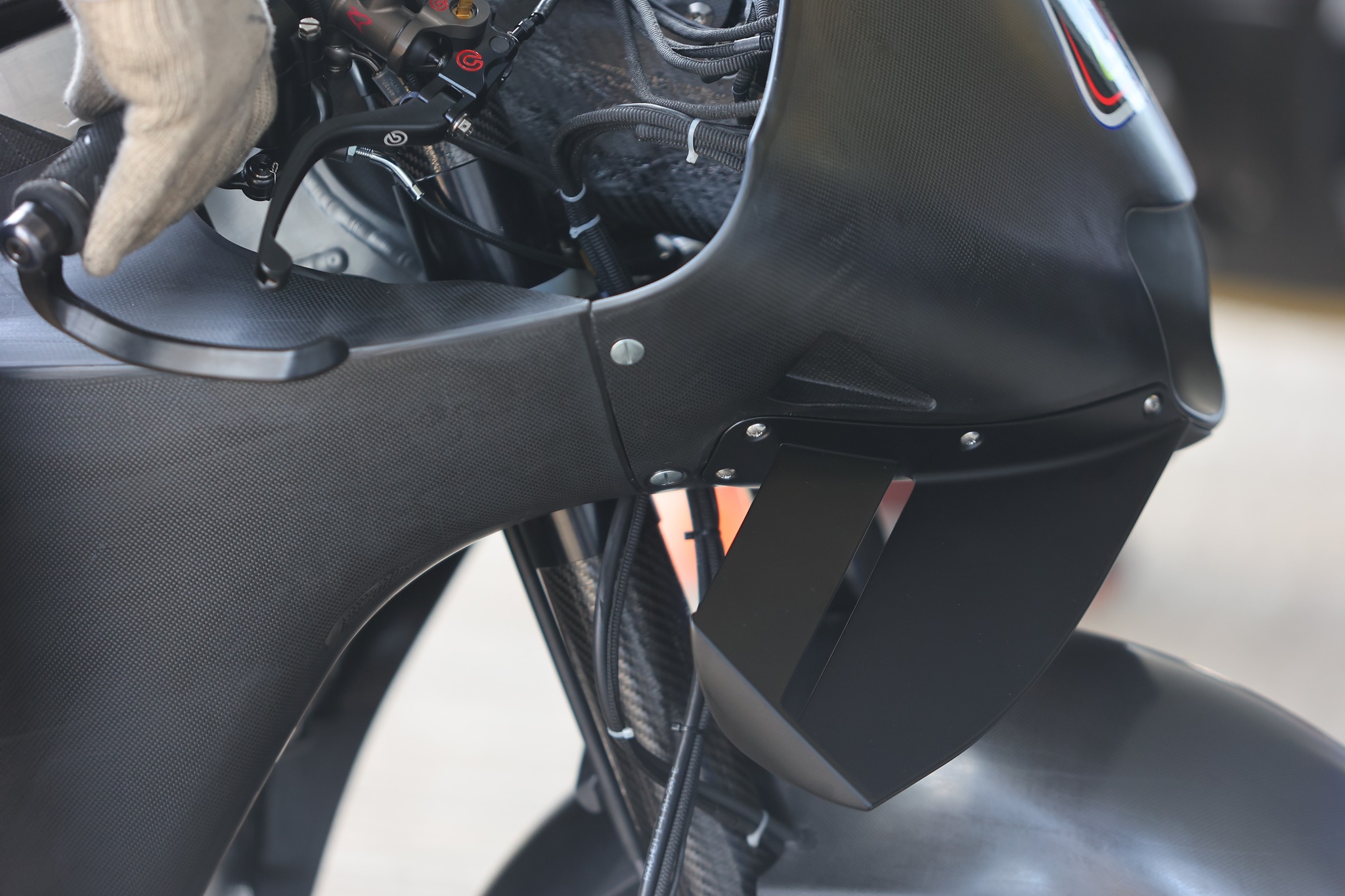 Les similitudes entre la Honda RCV213V 2023 et l’Aprilia RS-GP sont évidentes. L’ensemble de la face avant – y compris le carénage – n’est pas peu évocateur de celui des Aprilia, tandis que les deux convoyeurs situés dans la partie basse du carénage latéral, conçus pour obtenir un effet de sol, apparaissent très similaires à ceux des Ducati.