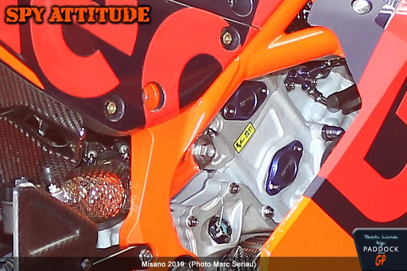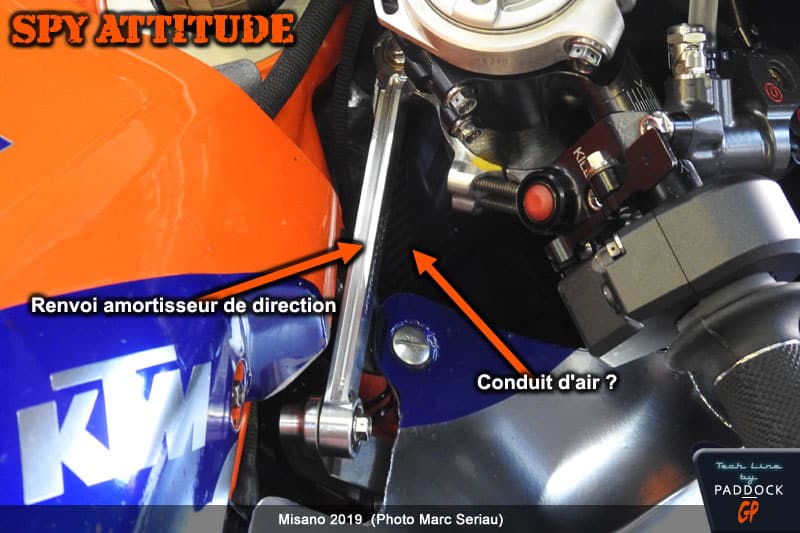 Quoi qu’il en soit, KTM s’est également mis à l’ouvrage pour utiliser la même disposition, quitte, comme Honda, à devoir déplacer l’amortisseur de direction, sur le côté avec un renvoi chez les Autrichiens, sur le dessus directement chez Honda. Contrairement à Honda, cela est complètement passé inaperçu pour KTM, et c’est d’ailleurs seulement le renvoi de l’amortisseur de direction (rotatif chez KTM) qui nous a mis la puce à l’oreille…