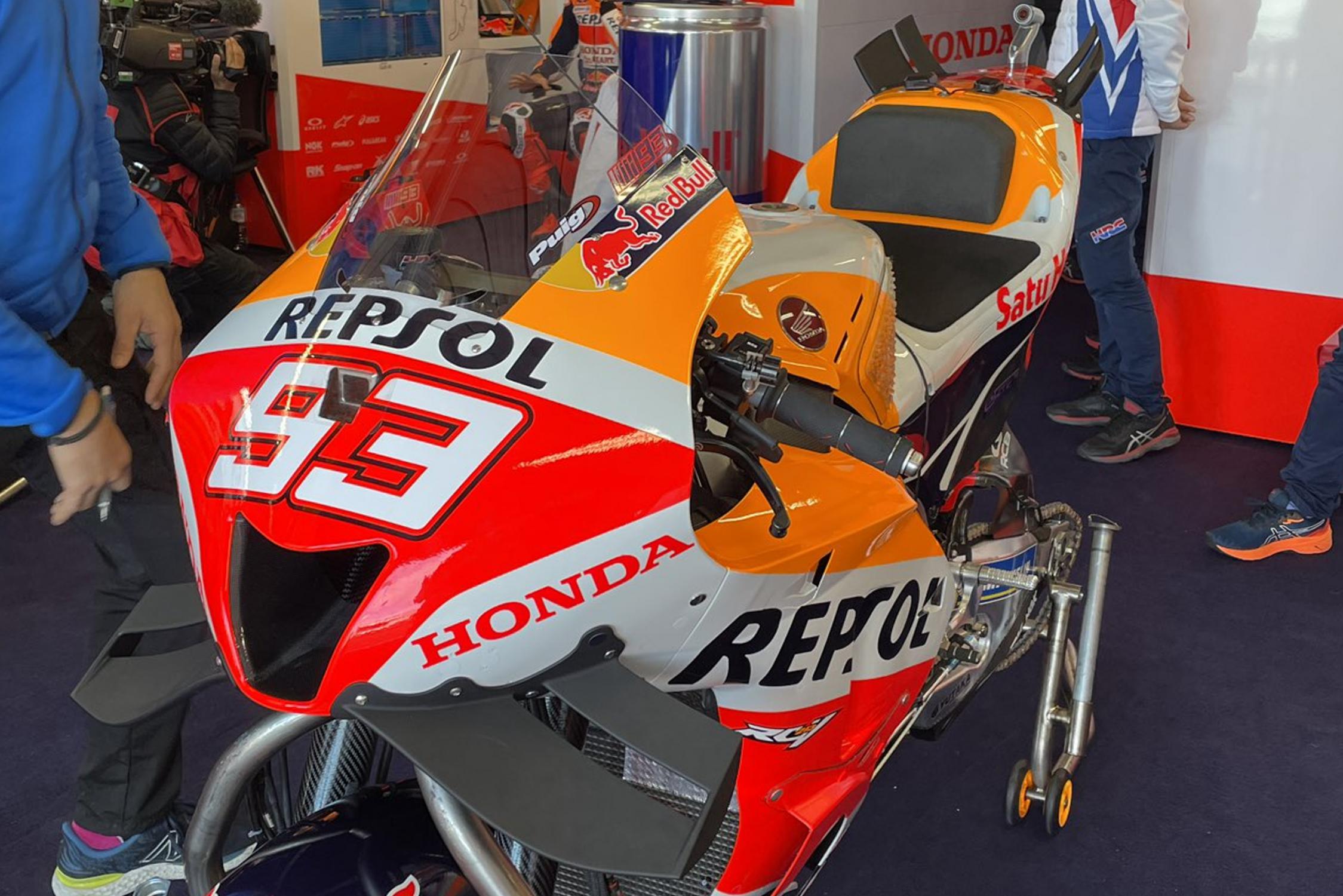 Les ailerons sur l’avant de la moto avaient déjà fait leur apparition en piste lors du test de Misano, où Marc Marquez est revenu pour la première fois en piste après son opération. Ils sont beaucoup plus similaires à ceux utilisés sur l’Aprilia RS-GP, les profils aérodynamiques étant plus proches que le package aérodynamique standard de la Honda.