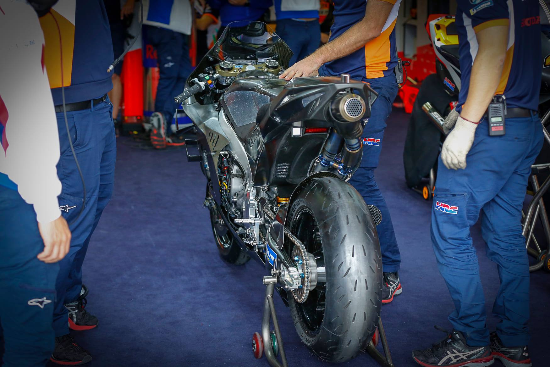 L’évolution qui saute le plus aux yeux est l’admission d’air. Les équipes d’ingénieurs HRC semblent vouloir modifier la façon dont la puissance est délivrée par le moteur. La raison est assez simple : changer l’admission d’air modifie la façon dont la boîte à air est remplie, et change le comportement du moteur. Si Honda teste une nouvelle évolution du moteur voire développe un nouveau moteur, il est classique de modifier légèrement l’admission ou la redessiner complètement comme nous le voyons ici avec Honda.