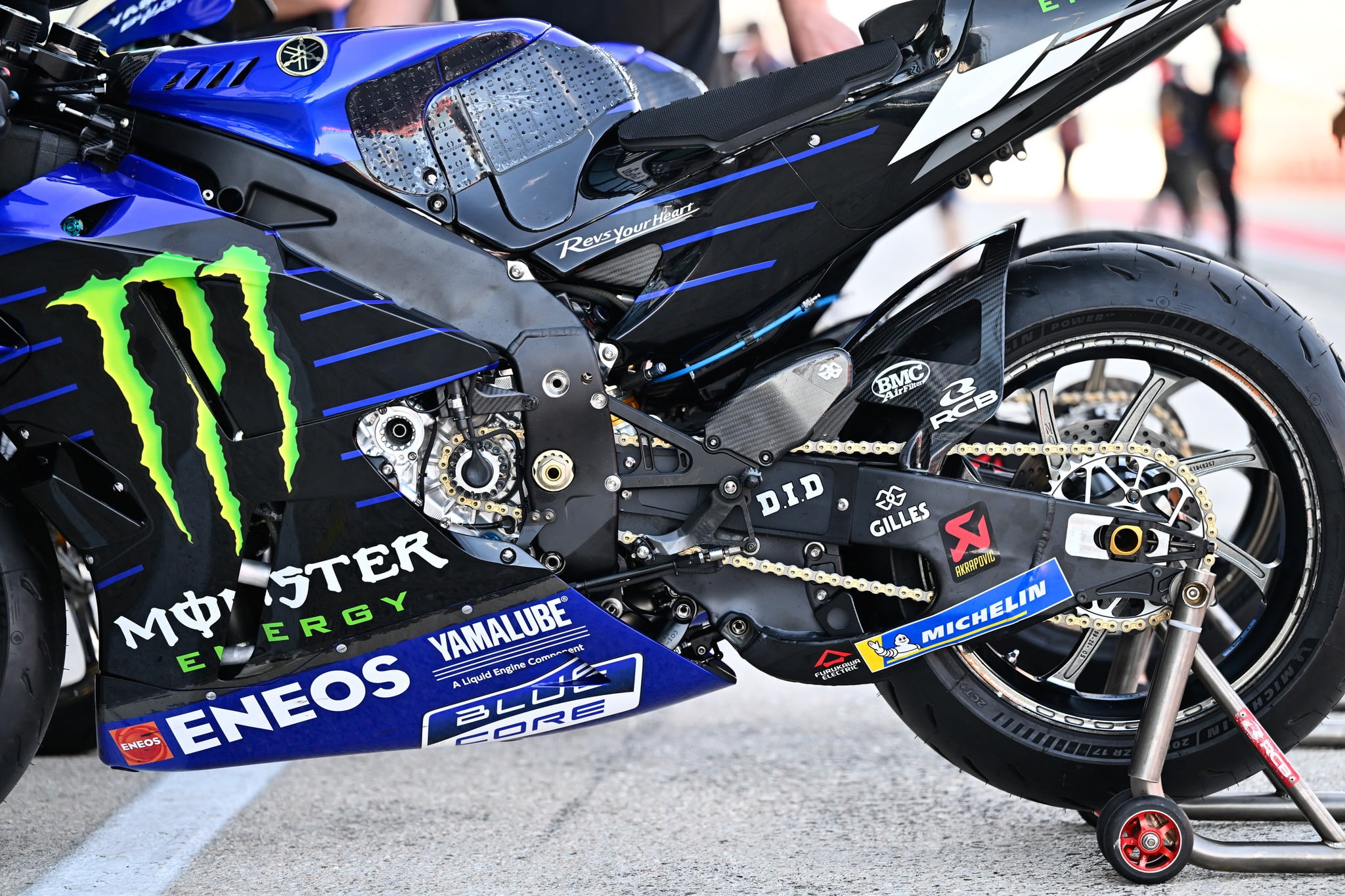 On observe sur cette photo le châssis 2022 que les pilotes Yamaha utilisent jusqu’à présent : au niveau de l’endroit où les genoux du pilote se situent, c’est là que se situe la différence avec le nouveau châssis.