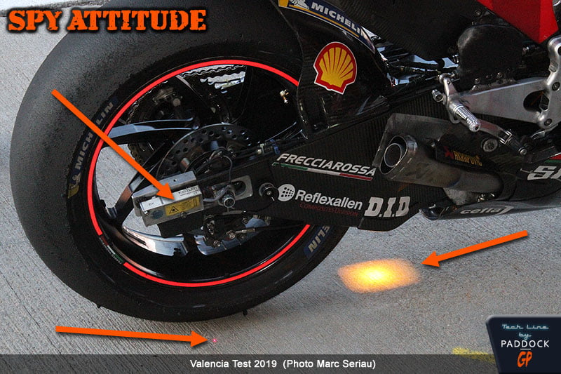 Les lasers servent à étalonner le comportement du pneu arrière en ce qui concerne la déformation, un travail réalisé en collaboration avec la société italienne MegaRide.