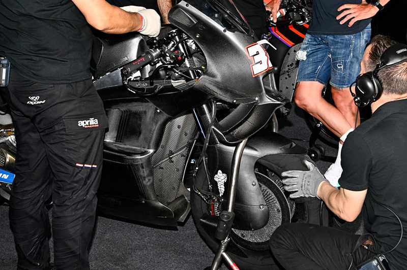 A côté des suspensions et de l’aérodynamisme, il semble maintenant évident qu’Aprilia travaille sur un domaine trop souvent négligé jusqu’à aujourd’hui, le flux d’air à l’intérieur du carénage. Grosso-modo, jusqu’à présent la majorité de l’air, après avoir été fortement ralenti par l’énorme radiateur, sortait comme il pouvait par des extracteurs latéraux après avoir encore été réchauffé par les échappements, le restant brûlant le pied droit du pilote…