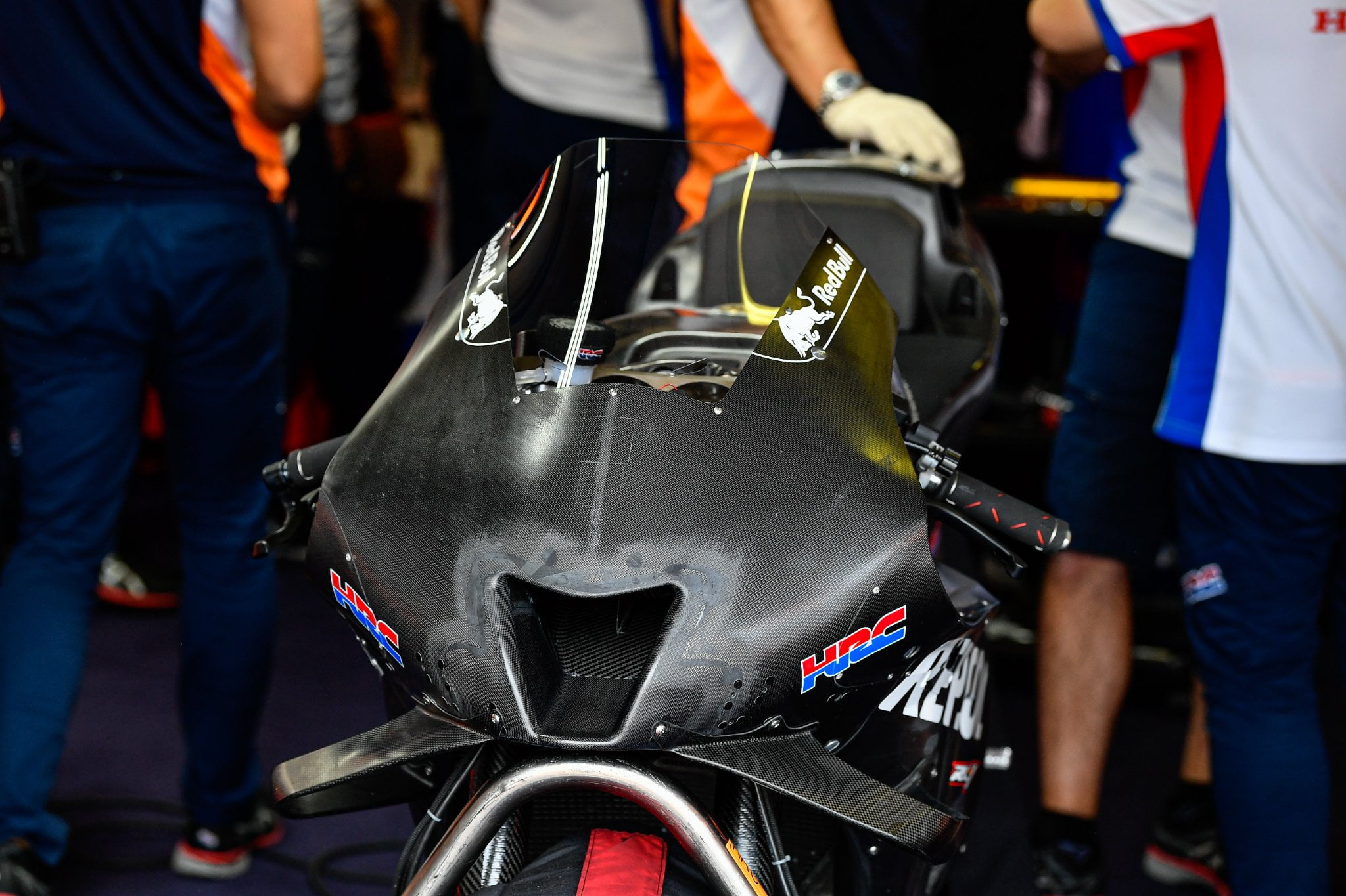 Les dernières modifications apportées sur la RC213V de Takaaki Nakagami concernent la partie avant. Voici l’admission d’air, l’ensemble aérodynamique et le carénage avant d’origine de son prototype 2022. Sur la dernière version, apparue en piste ce WE, tout cela a changé.