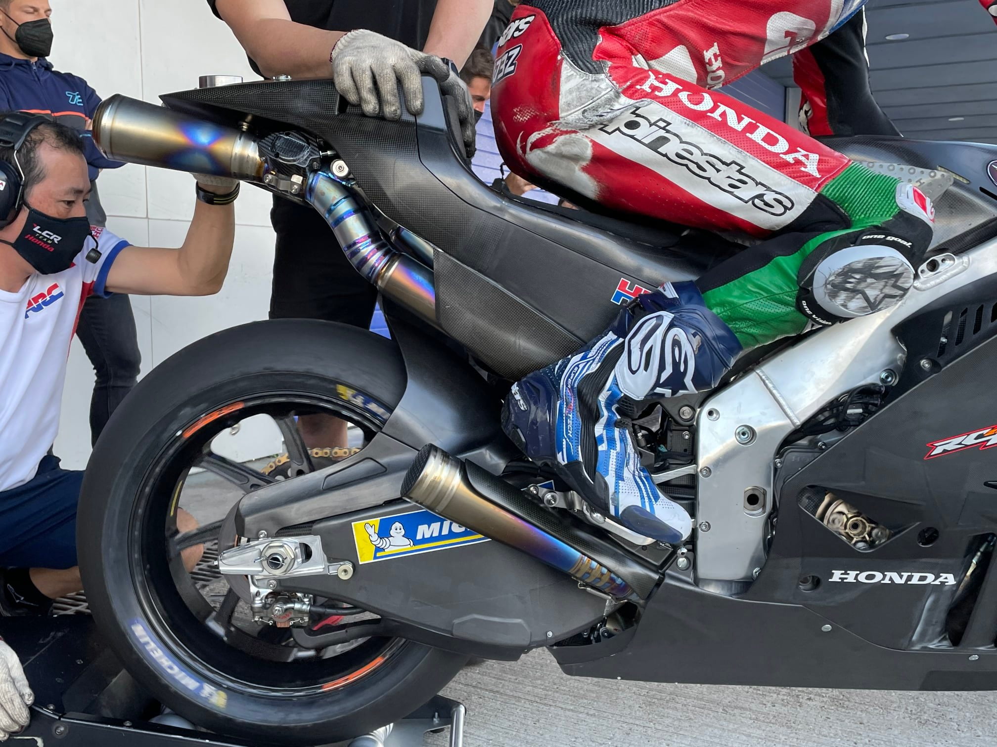 Le prototype 2022 de la Honda RC213V fait l’objet d’un examen minutieux et il y a de bonnes raisons à cela. Les deux dernières saisons ont été extrêmement difficiles pour l’équipe HRC, mais maintenant, il semble que cette machine leur permette de rebondir. L’un des plus grands changements est le moteur, associé à ses nouveaux échappements. On peut d’ores et déjà vous dire que le bruit de la Honda 2022 est très différent de la 2021, pour le reste, il est masqué derrière le carénage. Concernant les échappements, celui du bas, pour les cylindres avant, n’est pas très différent de ce que nous voyons sur la version 2021, mais celui du haut, qui évacue les gaz des cylindres arrière, sort désormais sur le côté pour s’adapter à ce qui semble être un amortisseur de masse dans la boucle arrière.