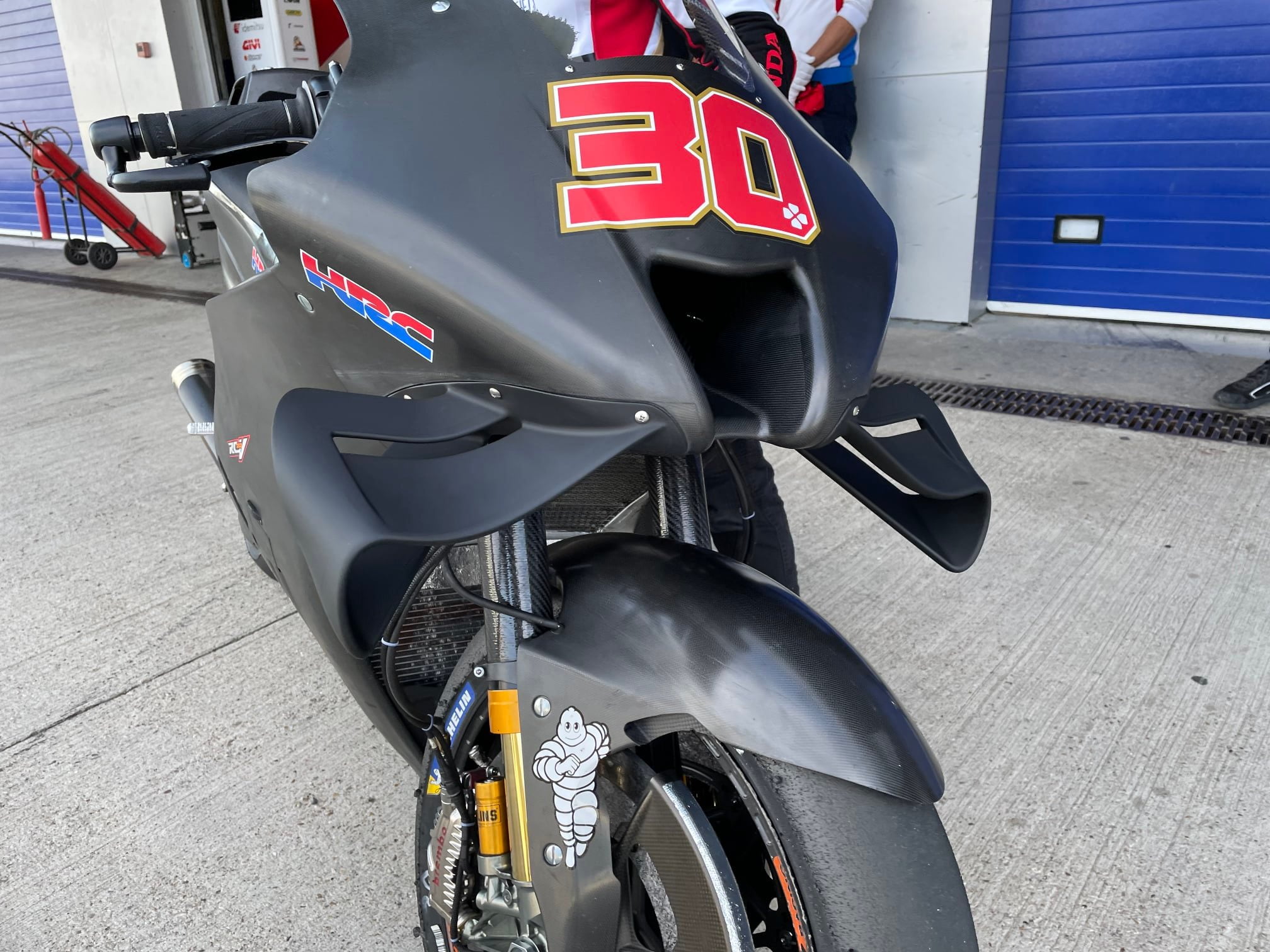 L’avant de la nouvelle RC213V est également entièrement nouveau. A Misano, les équipes techniques Honda ont testé diverses prises d’air. Il semble que la version retenue ne soit plus plate et large, comme en 2021, mais étroite et haute.
