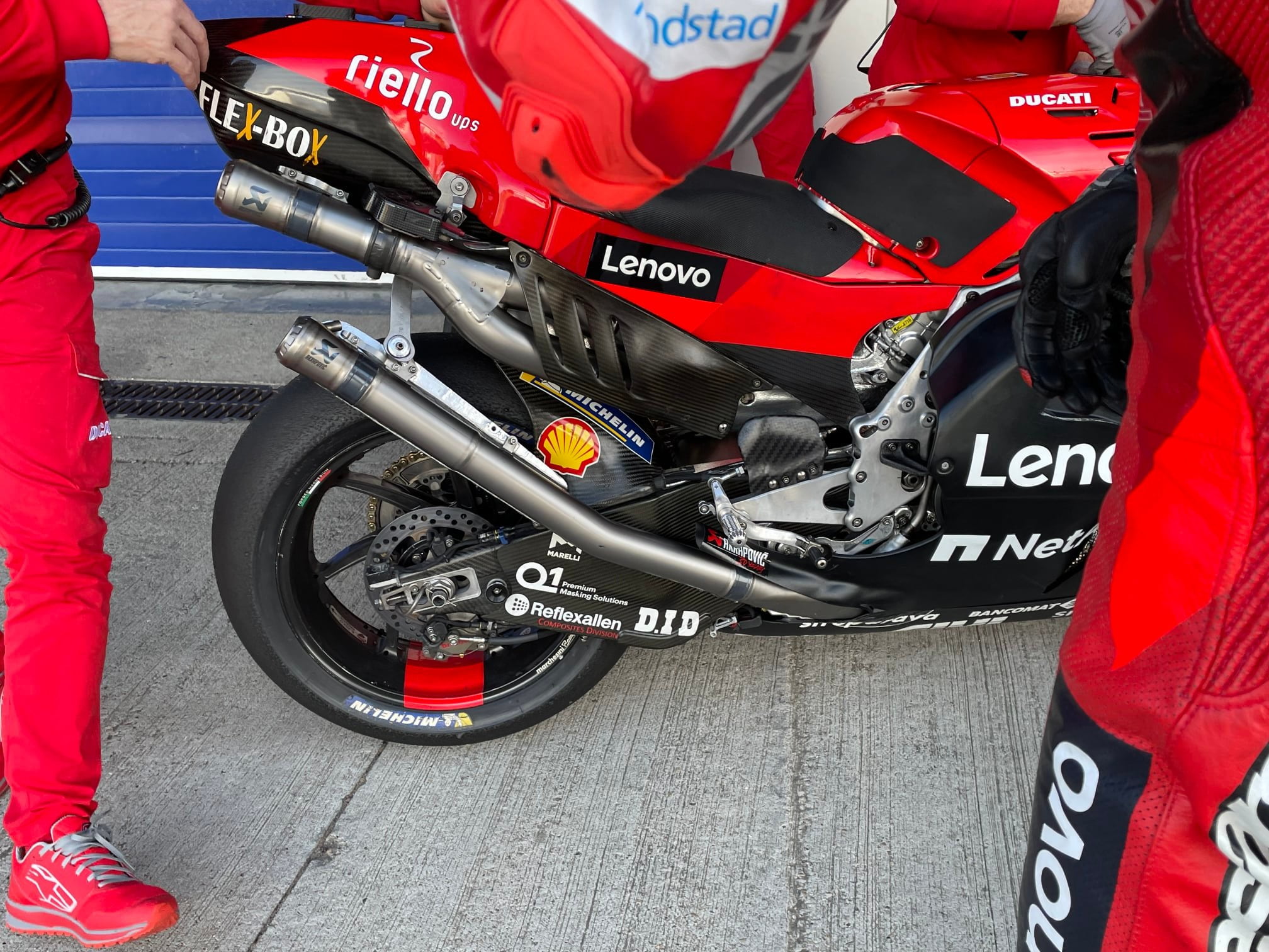 Ducati a testé un nouvel échappement, assez proéminent, qui n’est pas sans rappeler ce que Yamaha avait testé en 2020 à Misano. Le travail du concepteur de tuyaux d’échappement est de créer une zone de couple moteur suffisamment large pour que le pilote, en utilisant la boîte de vitesses, puisse maintenir le moteur dans cette zone la plupart du temps.