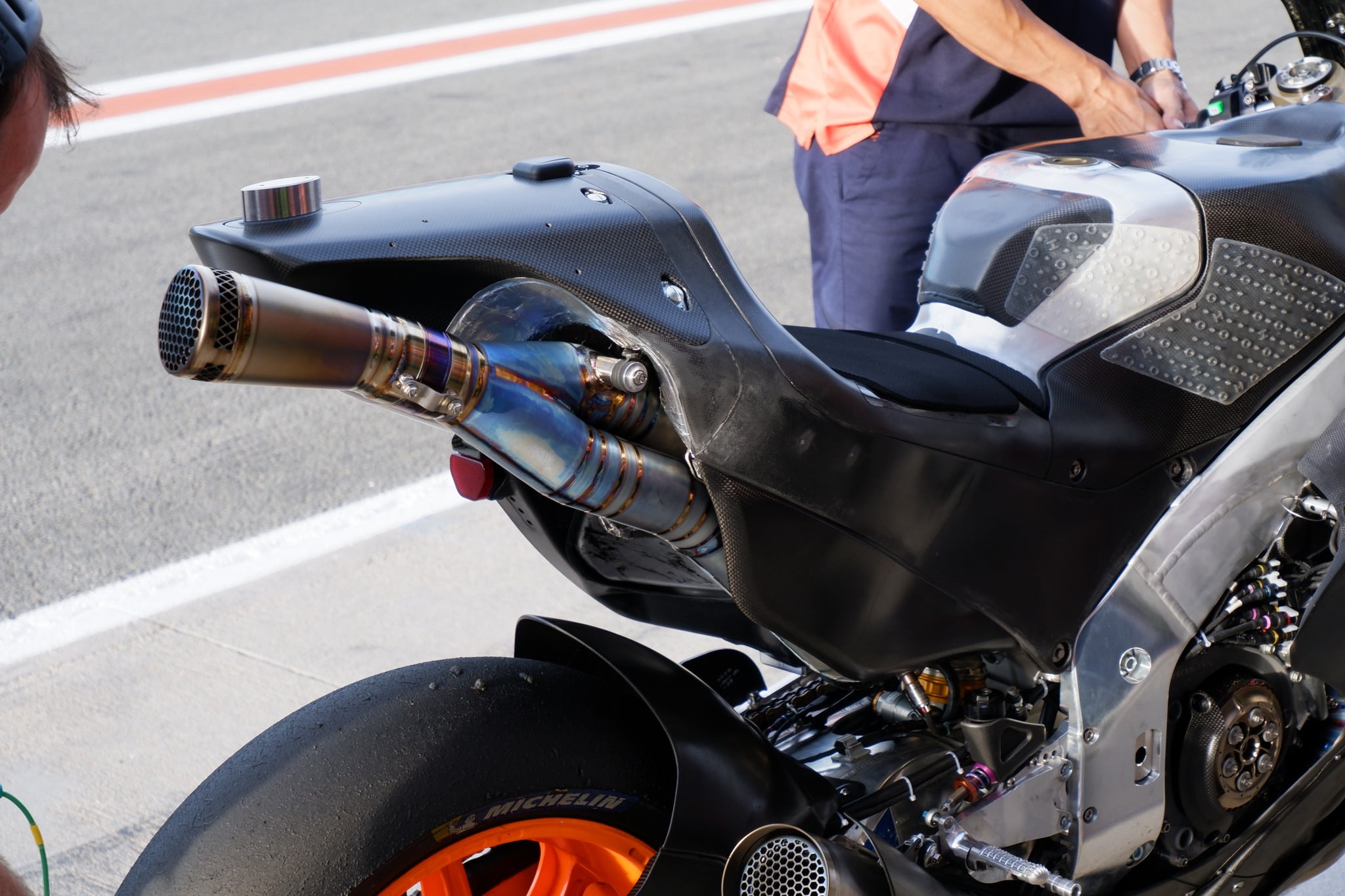 Voici la boucle arrière de la nouvelle Honda RC213V, où l’observe les échappements et les ailerons disposés sur le capot de selle, ayant déjà subi quelques évolutions par rapport à leur première version.