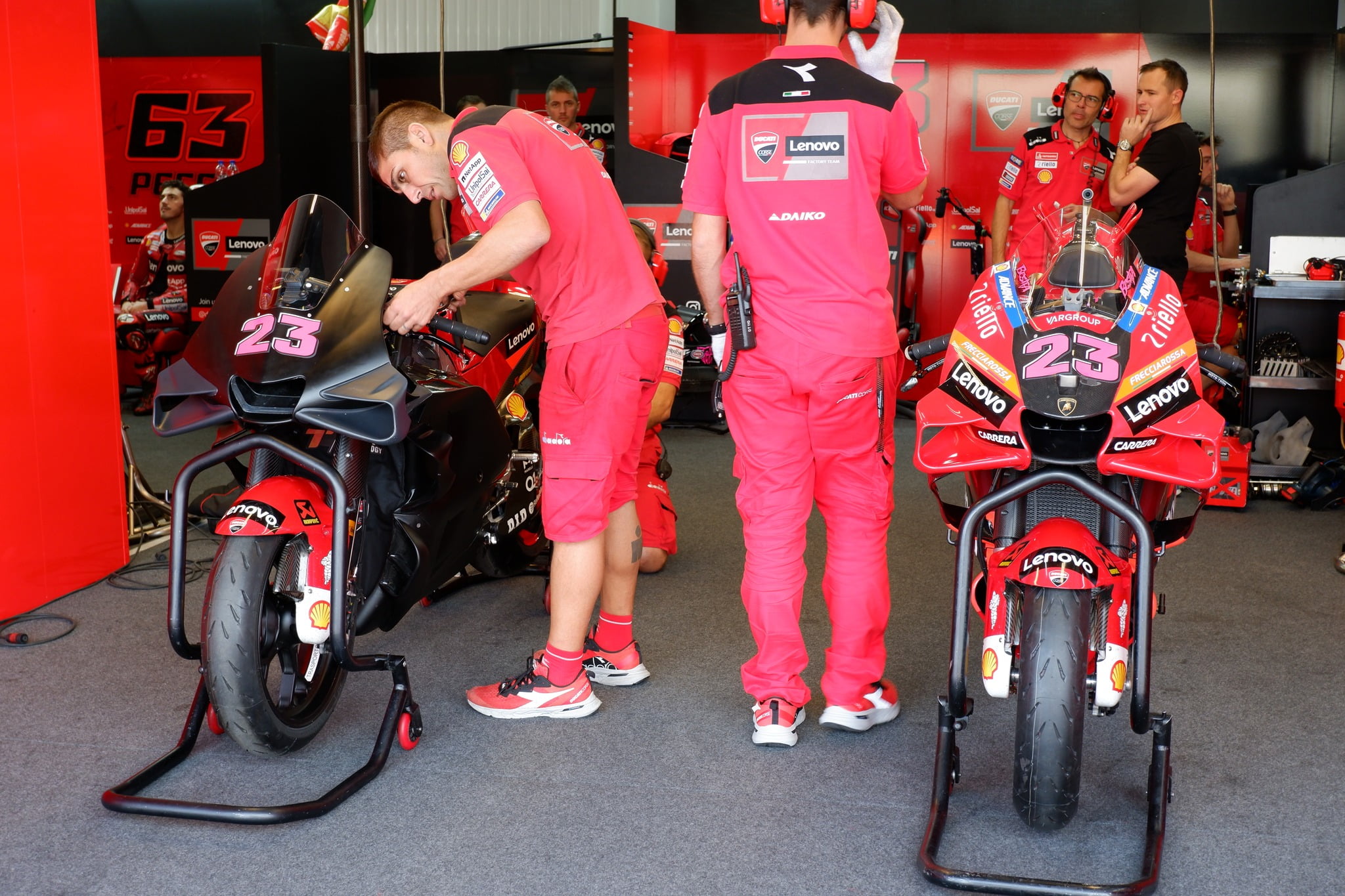 L’usine de Bologne a également essayé des carénages latéraux bombés, à l’instar de KTM, même s’il semblait que Pecco Bagnaia n’appréciait pas cette évolution. Nous reviendrons sur ces carénages dans un prochain article.