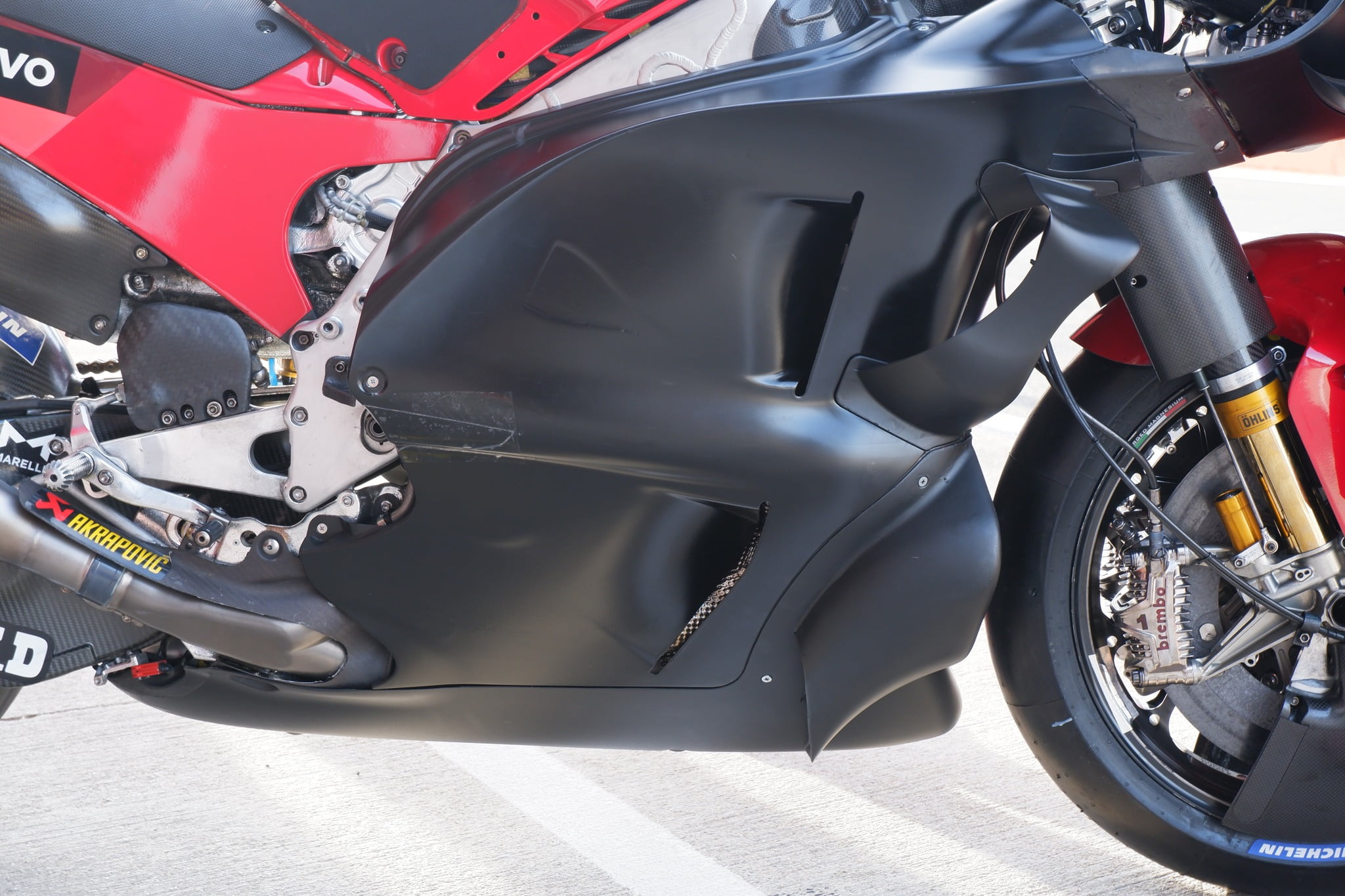 Les ailerons disposés sur les carénages latéraux ont également été mis à jour : ils paraissent plus hauts. En bas, le carénage latéral est bombé un peu comme le design d’Aprilia. Il y a aussi un petit détail de ce qui ressemble à un petit générateur de vortex tout en bas du carénage. Cette petite pièce pourrait servir à conditionner le flux d’air pour renforcer l’effet de sol que le carénage crée.