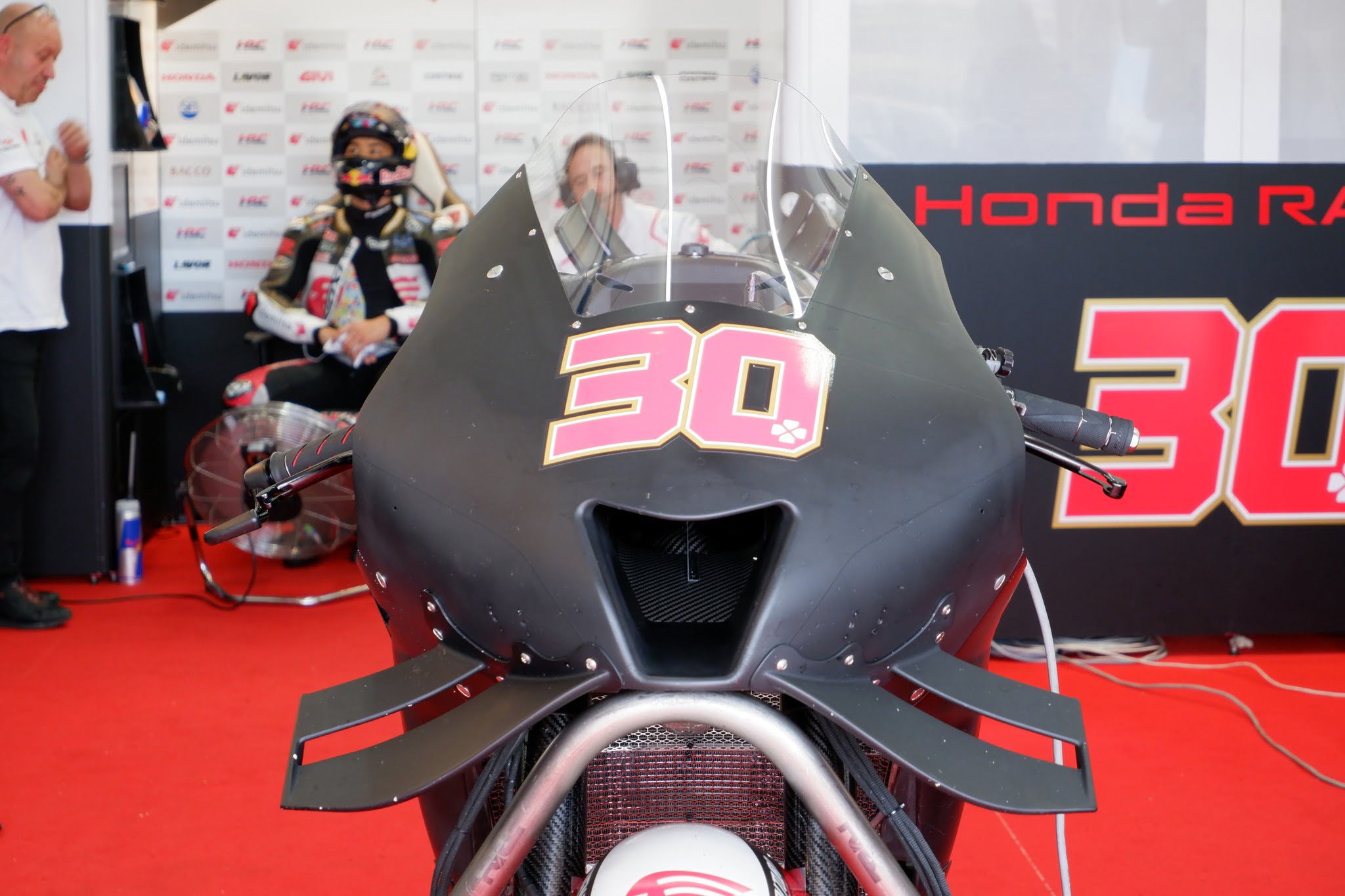 Sur cette photo, on observe la face avant de la Honda RC213V de 2022, en version standard.