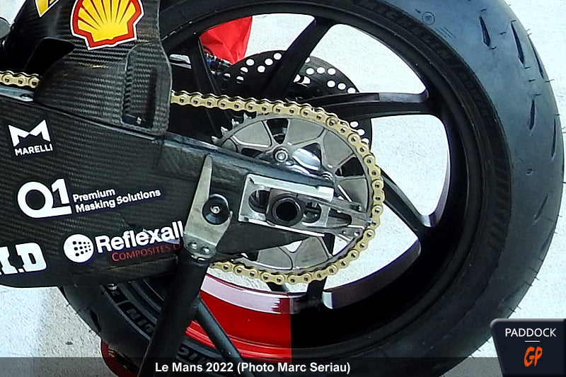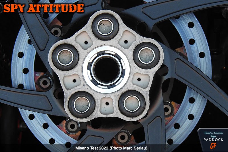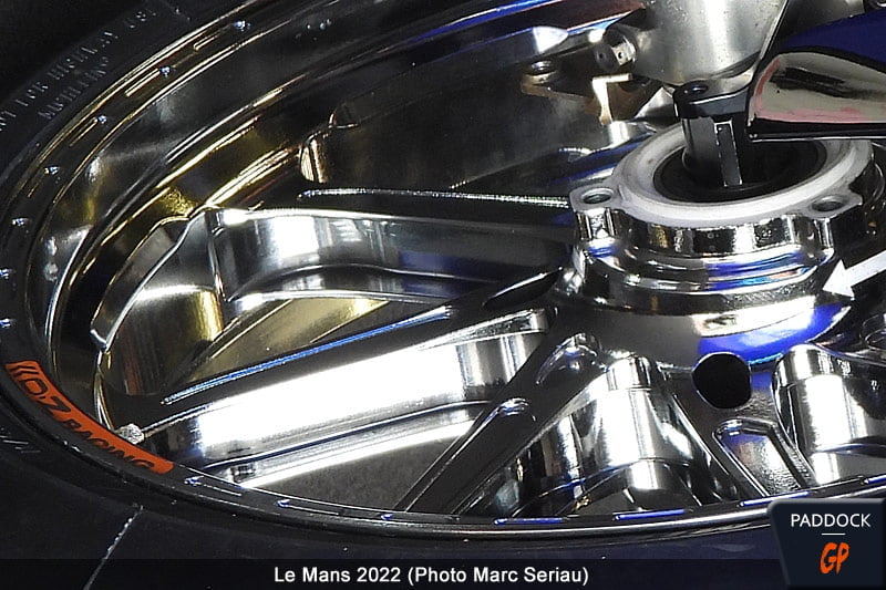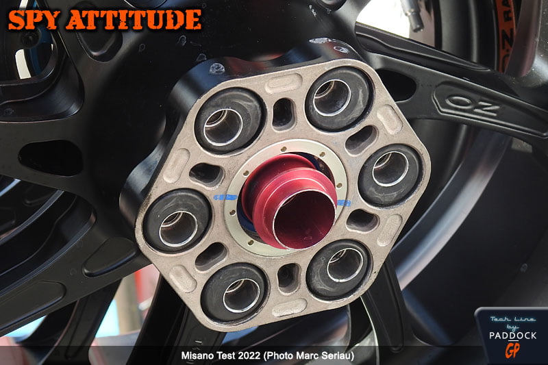 À ce sujet, et ce n’est sans doute pas une règle absolue tant ces éléments sont simples à intervertir, nous avons remarqué des jantes Marchesini avec des silentblocks comme sur nos motos de série, c’est-à-dire avec la partie métallique bien centrée dans le caoutchouc, mais aussi des jantes OZ où cette partie était décentrée, laissant une plus grande place à l’amortissement à la décélération, au détriment de celui à l’accélération. Intéressant, non ?