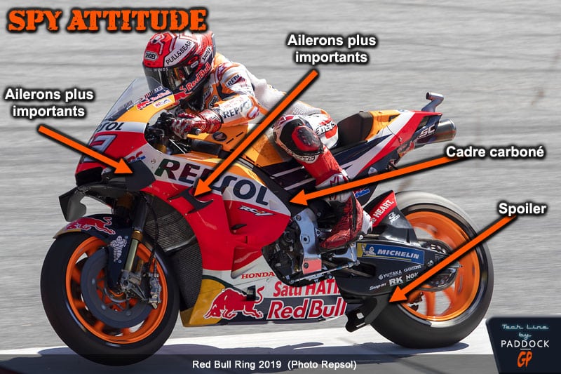 Voir ce que Marc Márquez utilisera à Silverstone sera donc intéressant et nous en apprendra sans doute un peu plus en détail sur la fonctionnalité de chaque élément, même si le champion espagnol reconnaît aisément que « La “cuillère” est là pour donner de l’appui durant le freinage. Cela a été d’une petite aide. Les nouveaux éléments aérodynamiques sont là juste pour contrer le wheelie, et cela a été une autre petite aide. C’est pour cela que nous avons pu rester avec Dovi. Concernant le châssis, nous avions encore quelques doutes mais dès le vendredi il a été très bien car il a des points très positifs. Il a aussi des points faibles mais sur ce circuit, le positif l’a emporté sur le négatif ».