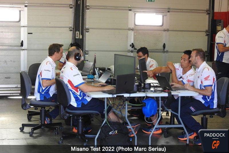 Le HRC disposait à notre connaissance de trois motos, mais bien plus de configurations ont été testées, chaque moto échangeant ses éléments avec les autres. Le sujet de cet article était le prototype le plus différent par rapport à la RC213V utilisée jusque là : de par sa selle incluant la Salad Box et sa prise d’air avant, on peut dire qu’il préfigurait la machine 2023, ou même celle utilisée en fin d’année.