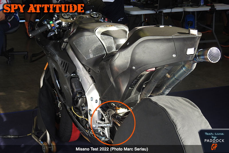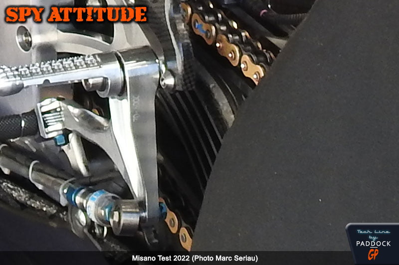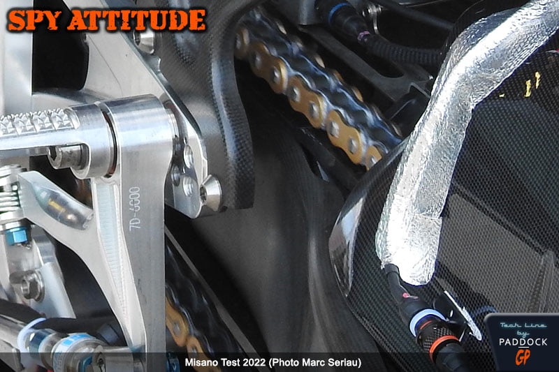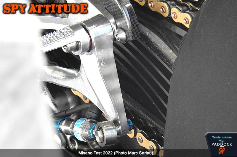 Mais, cette fois, dans le box, il était équipé d’un bras oscillant en carbone comportant ce qui apparaît être des renforts latéraux horizontaux pour en augmenter sa rigidité latérale près de son axe, avec une apparence qui n’est pas sans nous rappeler les ailettes de la Ferrari Testa Rossa.