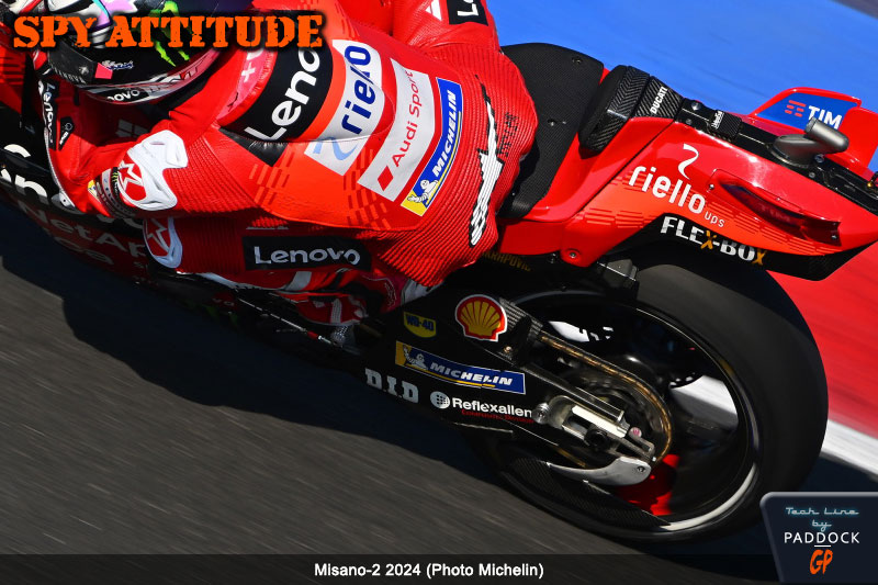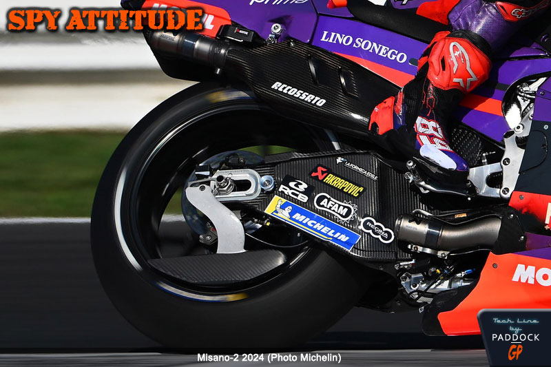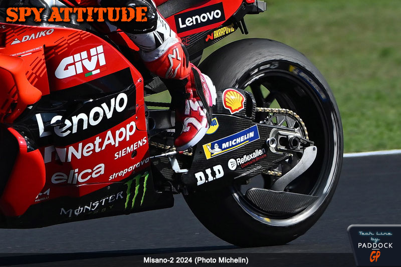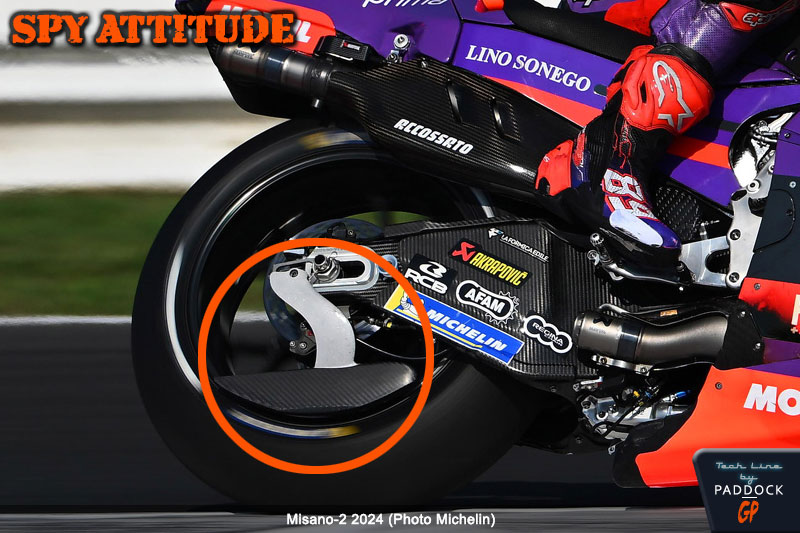 Lors de la FP2, qui n’a aucune incidence directe sur les qualifications, Jorge Martin et Enea Bastianini sont sortis en piste avec des palettes de roue arrière. A priori, attendre la FP2 de 30 minutes précédant les qualifications pour tester une évolution aérodynamique semble un peu incongru, d’autant que nous n’avons pas aperçu Francesco Bagnaia avec de tels éléments, ce qui nous laisse penser que ces derniers avaient déjà été essayés, même si nous ne les avons pas vus lors du dernier test. Cela nous semble d’ailleurs d’autant plus probable que, sans coup férir, les deux pilotes les ont conservés pour le Sprint…
