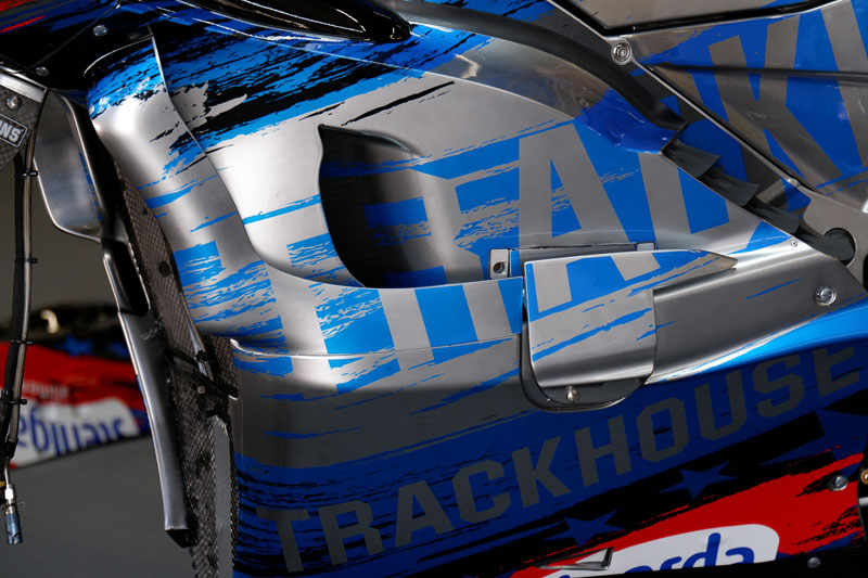 On voit beaucoup mieux le concept de la nouvelle aérodynamique, destiné à apporter de l’appui et de l’effet de sol avec la moto inclinée, avec les couleurs du team Trackhouse.