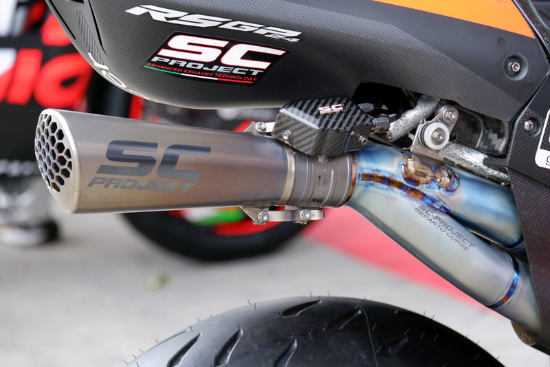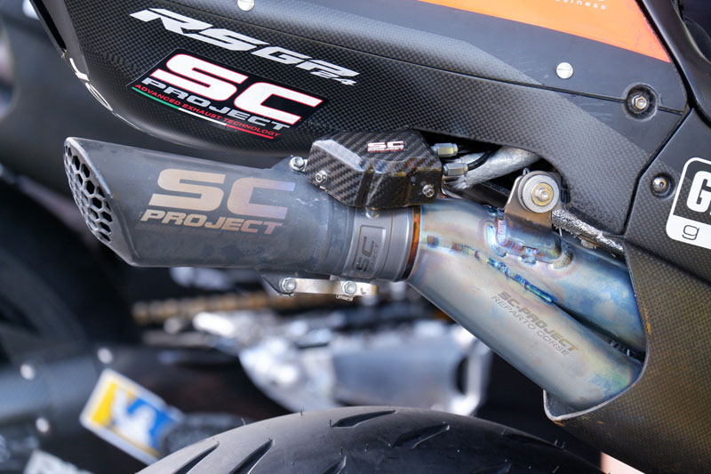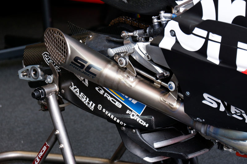 Enfin, un nouvel échappement est apparu en Autriche, à peine différent pour les cylindres arrière du V4 de Noale,  mais notablement plus long pour les cylindres avant, sans doute toujours dans le but de rendre le moteur plus exploitable avec le moins de limitation électronique possible…