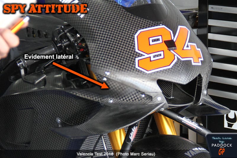 Le nouveau carénage tête de fourche se distingue de l’ancien modèle par des angles plus prononcés destinés à générer plus d’appui aérodynamique pour contrer le wheelie. De plus, le retour ds évidements latéraux au dessus des ailerons ont disparu pour donner place à un carénage plus étroit.