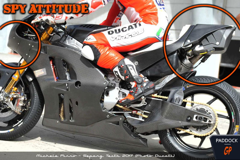 Et même si Gigi Dall’Igna avait annoncé que la GP17 définitive ne serait visible qu’au Qatar, on s’aperçoit tout de suite de plusieurs différences importantes sur la machine de Michele Pirrro: dessous de selle très « mystérieux » cachant une « boîte » et un échappement très décentré, et carénage englobant des protubérances apportant de l’appui à la place des ailerons.