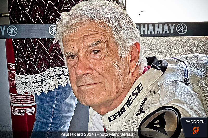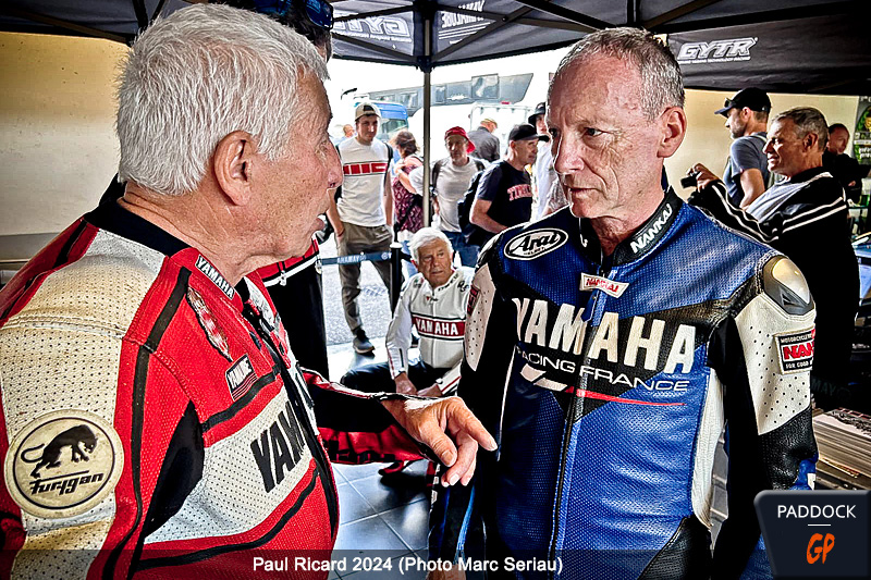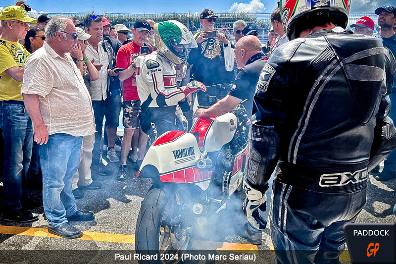 Moment magique d’une dizaine de minutes où nous pouvons simplement nous remplir les yeux en silence de cet emblème de la compétition en train d’attendre dans son cuir, en nous remémorant l’ambiance, visuelle, sonore et olfactive, des années MV puis Yamaha…