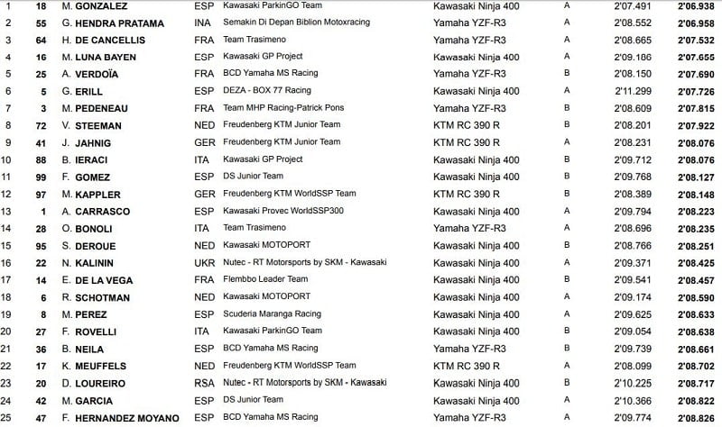 On trouvait ensuite sur la deuxième ligne Marc Luna Bayen (Kawasaki GP Project) en quatrième position, devant le premier du groupe B, Andy Verdoïa (BCD Yamaha MS Racing), une belle qualification pour le pilote de 16 ans pour la quatrième course de sa carrière en WorldSSP300. Guillem Erill (Deza – Box 77 Racing) complétait la deuxième ligne. Mateo Pedeneau – (Team MHP Racing) terminait septième et Enzo de la Véga se classait dix-septième.