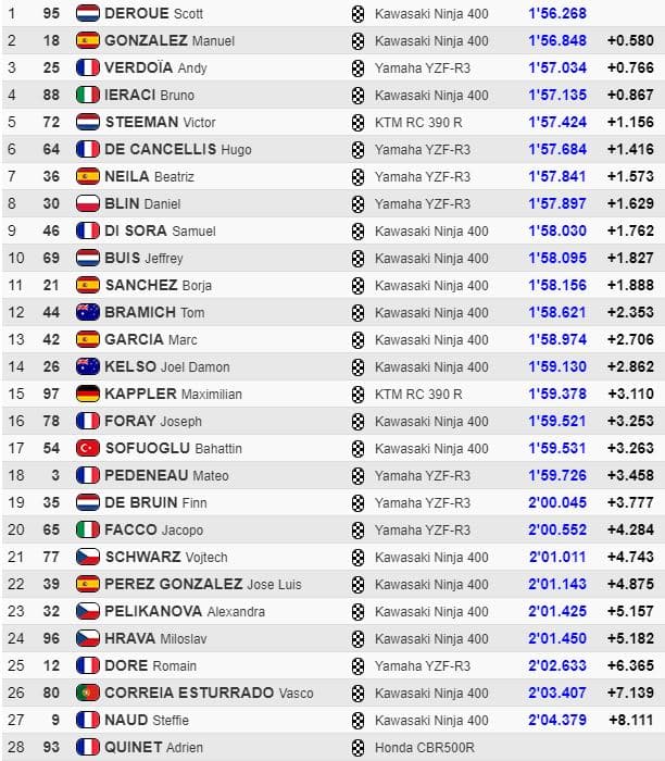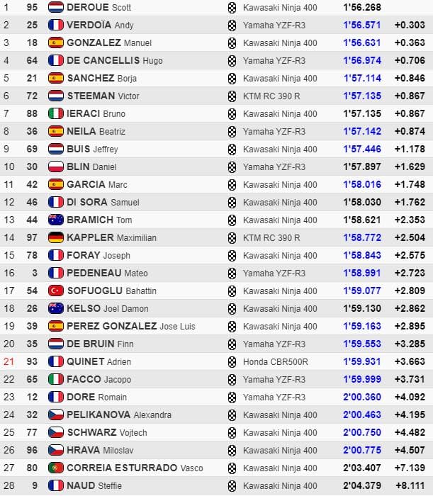 L’armada tricolore était beaucoup plus importante (et plus rapide) qu’en Groupe A avec Andy Verdoïa (Yamaha) 3e, Hugo de Cancellis (Yamaha) 6e, Samuel di Sora (Kawasaki) 9e, Joseph Foray (Kawasaki) 16e, Mateo Pedeneau (Yamaha) 18e, Romain Dore (Yamaha) 25e, Steffie Naud (Kawasaki) 27e Adrien Quinet (Honda) non-classé.
