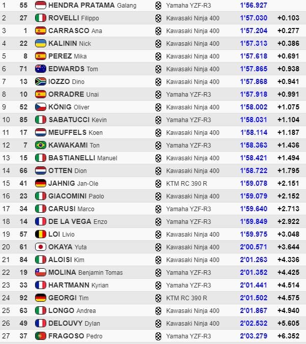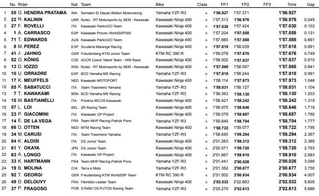Lors de la première séance d’essais libres du Groupe A, Filippo Rovelli (le fils du patron de l’équipe ParkinGO Giovanni Rovelli), coaché par Fabien Foret, menait pendant l’essentiel de la séance en 1’57.030. Puis Galang Hendra Pratama sur Yamaha prenait la tête en 1’56.927 devant cinq Kawasaki, dont celle de Nick Kalinin qui chutait sans gravité en fin de séance.