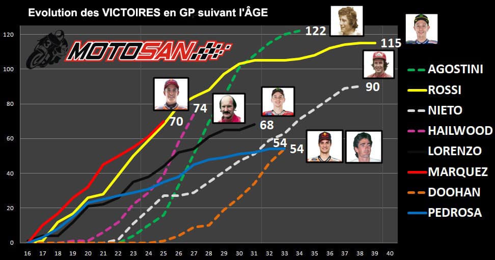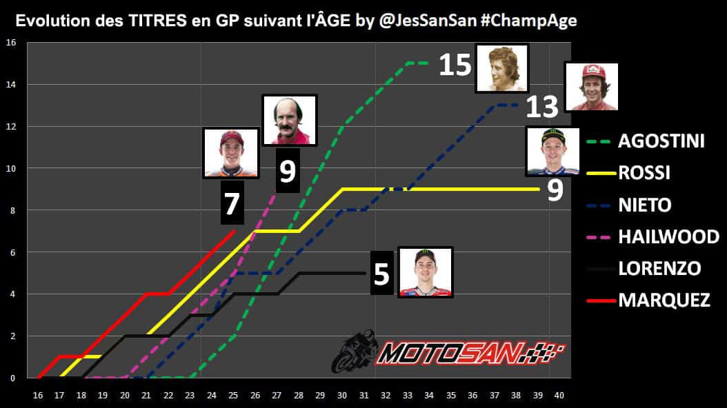 Si l’on considère les titres en Grand Prix, Marc Márquez est 6ème de l’histoire avec 7 unités, derrière Rossi, Ubbiali et Hailwood avec 9, Ángel Nieto avec 12+1 et Giacomo Agostini avec 15. Les deux plus éloignés semblent encore inaccessibles, mais égaler Rossi n’est pas impossible. Il se pourrait même que si Marc remporte les deux prochains titres et que Valentino décide de « raccrocher le cuir » à la fin de son contrat actuel, il égalera son grand rival au moment de la retraite de ce dernier.