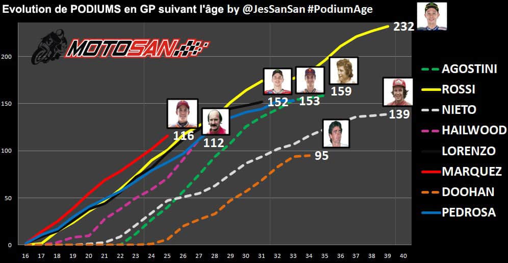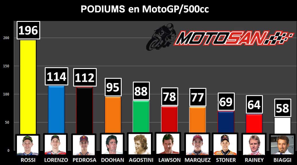Avec 77 unités, Marc Márquez est le 7ème pilote de l’histoire avec le plus grand nombre de podiums dans la catégorie reine (MotoGP/500cc) et, durant cette saison, il pourrait bien devenir le 5ème, en ayant seulement 11 podiums de moins qu’Agostini. Depuis ses débuts en MotoGP, il en a toujours réalisé 12 ou plus, sauf en 2015 où il n’a pas été champion. Il n’est pas déraisonnable de penser qu’en trois saisons, il puisse devenir le deuxième ou le troisième pilote avec le plus grand nombre de podiums de l’histoire, selon le niveau de Lorenzo. Mais rattraper Rossi est une autre histoire, et il aura besoin de prolonger sa carrière au plus haut niveau.