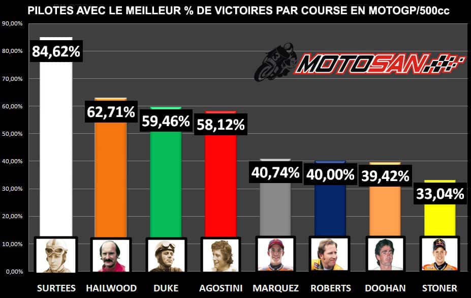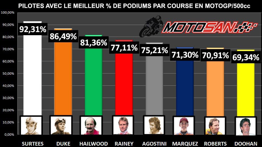En ce qui concerne le pourcentage de podiums par rapport aux courses MotoGP, Marc Márquez est en 6ème position. En tête 4 pilotes qui ont dominé à une époque où il y avait peu d’égalité mécanique, Surtees, Duke, Hailwood et Agostini, alors que le fait le plus impressionnant est peut-être le pourcentage de Wayne Rainey, à une époque comme aujourd’hui remplie de légendes et de nombreux candidats aux places d’honneur. Nous voyons aussi d’autres grands dominateurs comme Roberts ou Doohan fermer le TOP 8.